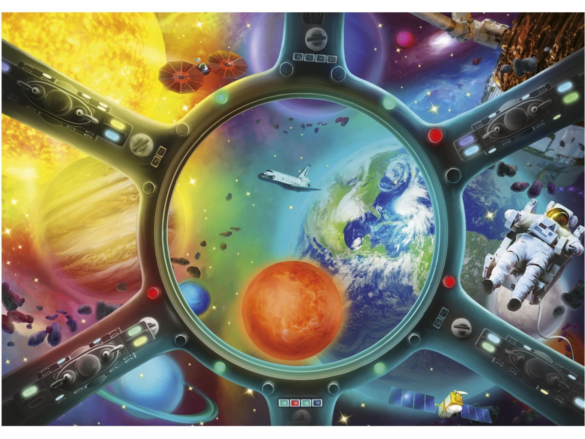 Imaginea puzzle-ului Spacewalk de la Educa redă un peisaj cosmic imaginar, cu o varietate de planete și corpuri cerești colorate intens în nuanțe de orange, albastru și verde. În centrul atenției se află pământul, privit de la distanță, alături de un saturn impunător și alte planete mai mici. Detaliile bogate ale fiecărui corp ceresc adaugă profunzime și dinamism acestei ilustrații digitale complexe.