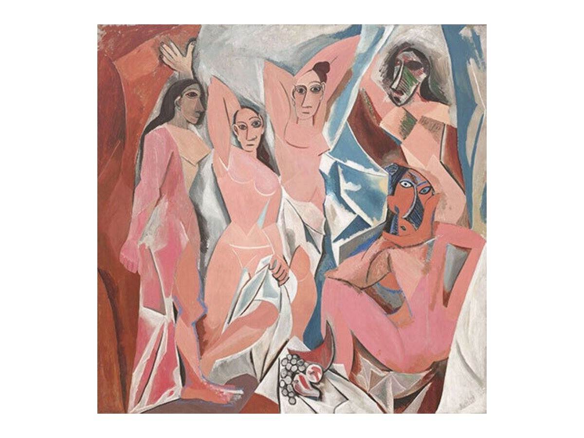 Această pictură, realizată de Pablo Picasso, este intitulată 'The Young Ladies of Avignon'. Opera de artă prezintă cinci femei nude, stând în diverse poziții, oferind o interpretare modernă și anticonvențională a formei umane. Femeile sunt reprezentate cu trăsături faciale distorsionate și ochi mari, stilizate, indicând influența artei africane. Fiecare figură este colorată diferit, de la nuanțe de roz la tonuri de alb și albastru. Fundalul este simplificat, cu linii abrupte care delimitează spațiul, caracteristică vizibilă a cubismului, stil artistic într-o fază incipientă aici.