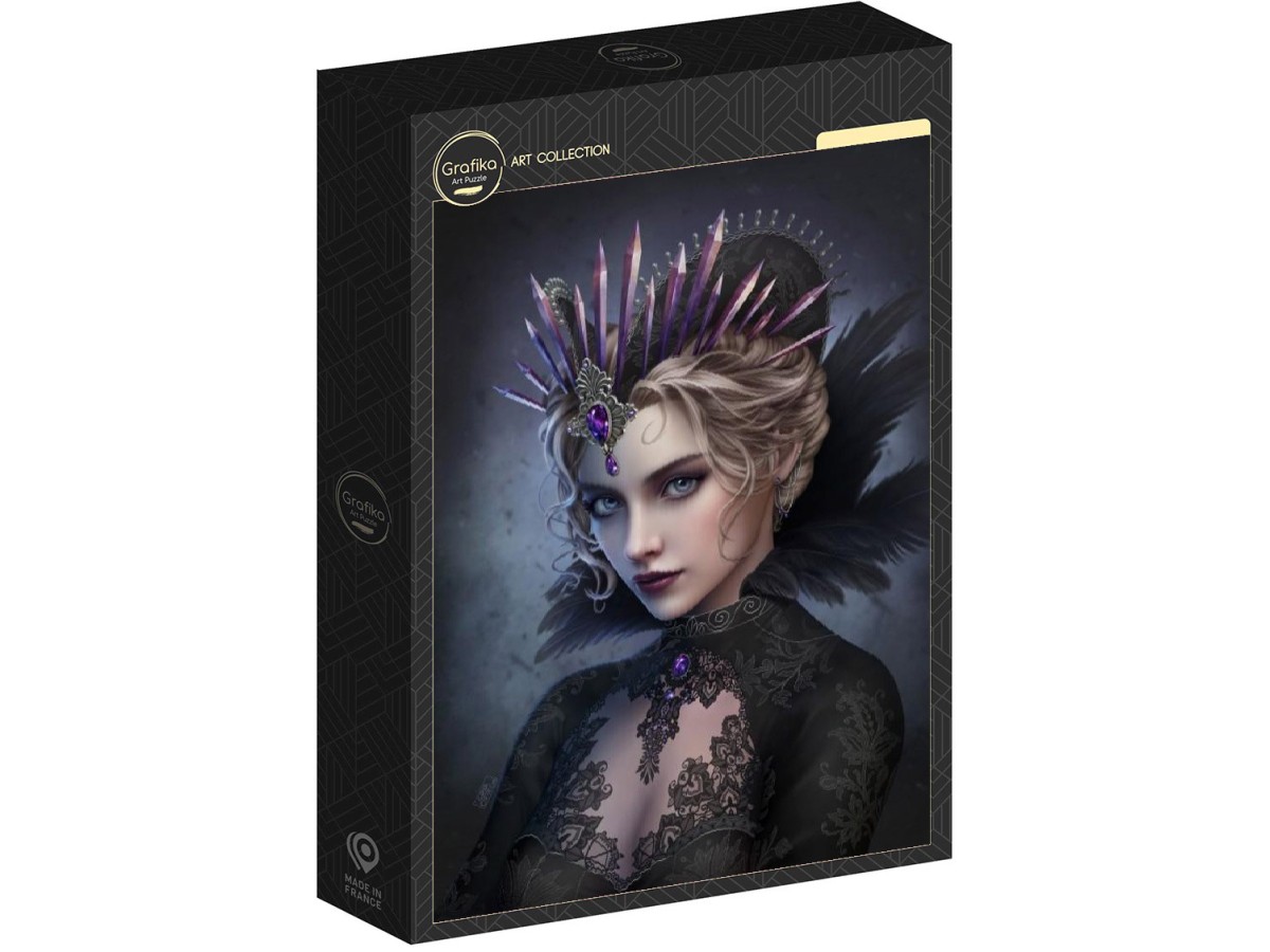 În puzzle-ul Grafika cu 500 de piese, intitulat 'Nightling Gaze', descoperi o ilustrație digitală captivantă ce surprinde figura elegantă a unei femei misterioase. Aceasta poartă o coroană impunătoare decorată cu cristale violet și pene întunecate, emanând o aură de regalitate și eleganță.