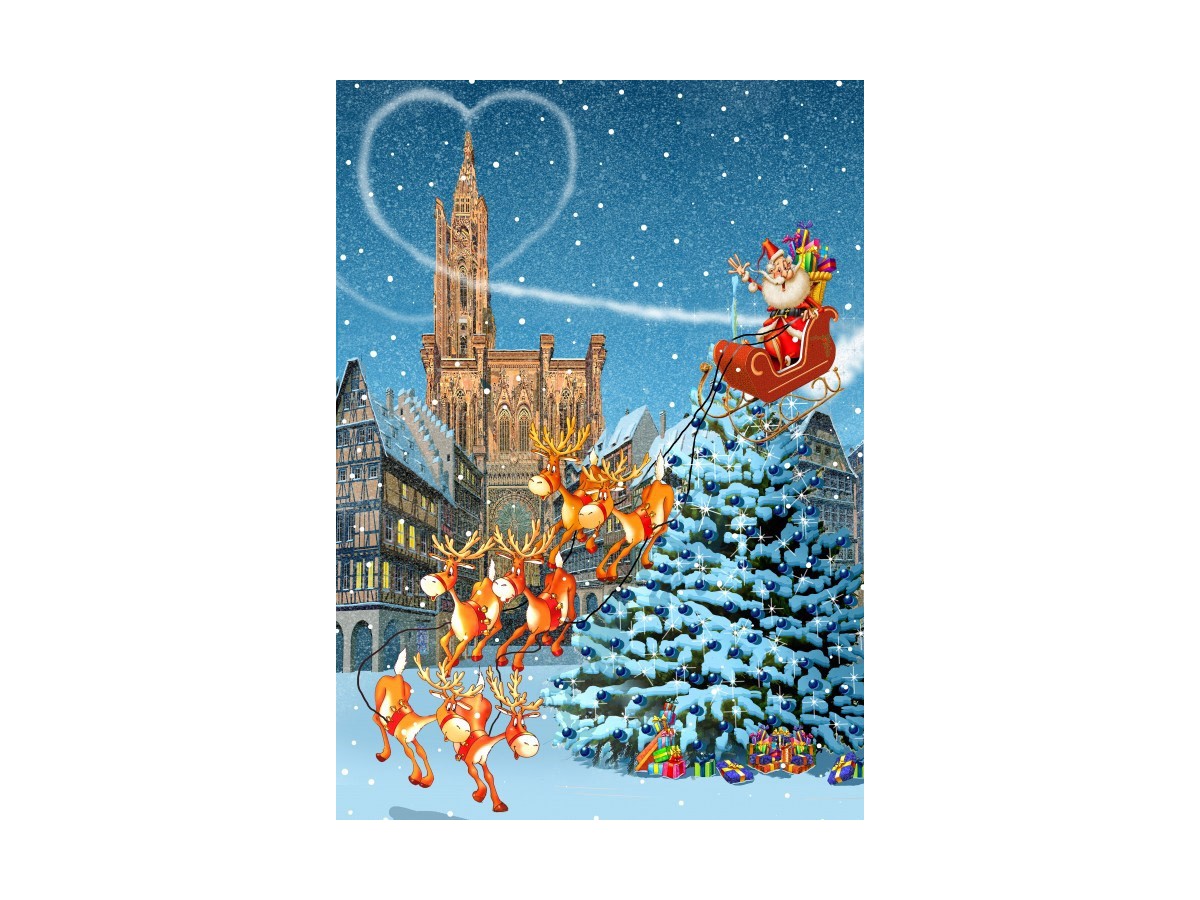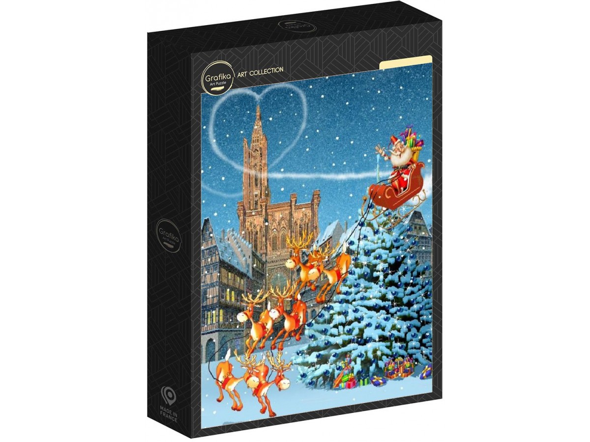 Imaginea puzzle-ului Grafika 500 piese - Francois Ruyer: Strasbourg Cathedral at Christmas surprinde o scenă festivă de Crăciun, în care Moș Crăciun zboară în sania sa tradițională, trasă de reni, peste un peisaj urban înzăpezit. În fundal, Catedrala din Strasbourg se remarcă prin detaliile sale realiste, iluminate de lumini calde ce contrastează cu cerul înstelat și întunecat. Un brad de Crăciun impunător, decorat cu lumini și globuri colorate, domină centrul compoziției, adăugând o notă de veselie și sărbătoare. Zăpada acoperă acoperișurile clădirilor și străzile orașului, iar cerul este animat de fulgi de zăpadă care cad liniștit.