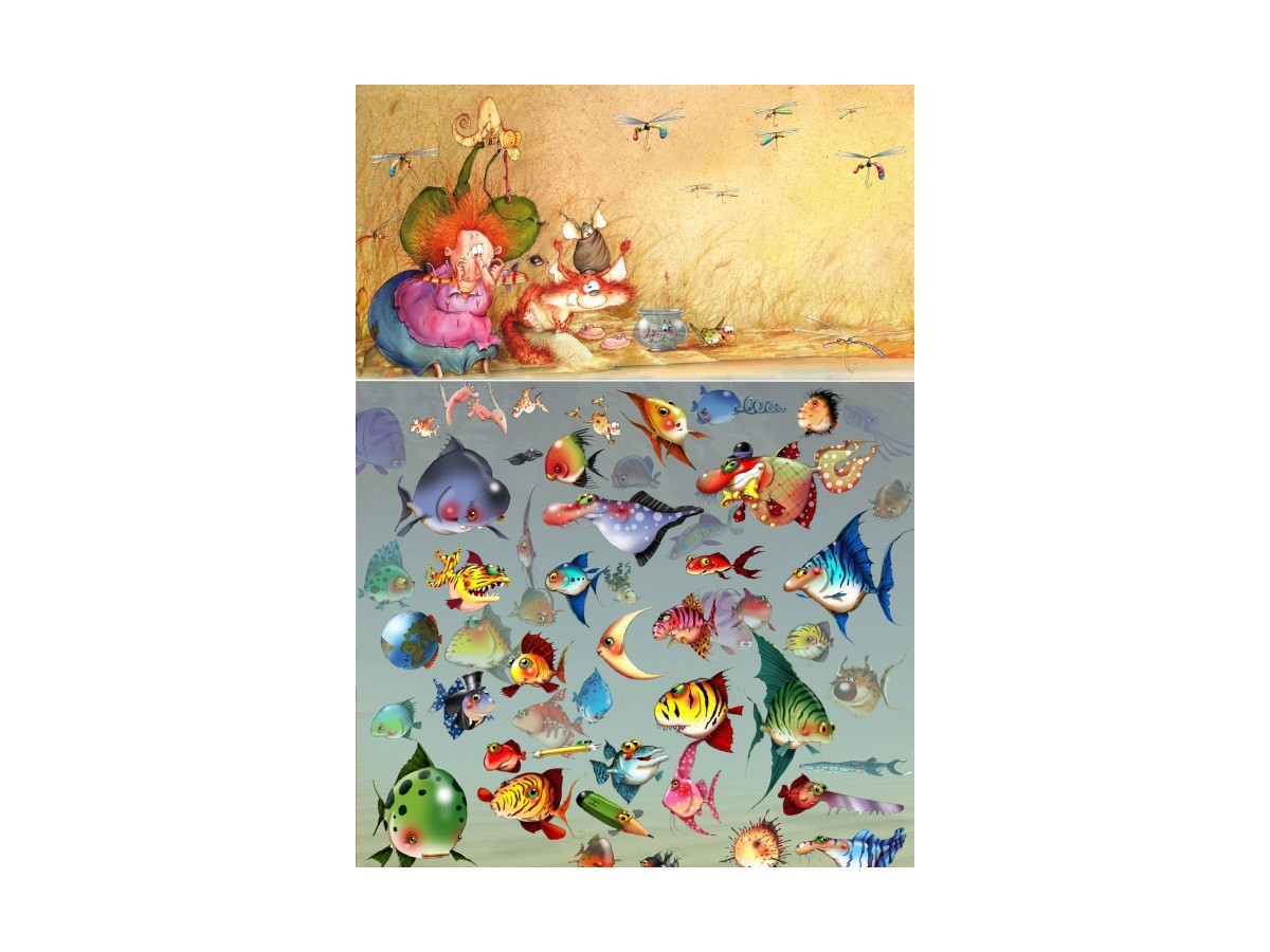 Partea inferioară a ilustrației este dominată de un spectacol subacvatic unde diferite specii de pești, de la cei tropicali până la un rechin îndesat într-un costum colorat, înoată împreună într-un decor marin plin de corali și plante acvatice. Această combinație de scene terestre și subacvatice aduce un contrast fascinant, îndemnând privitorul să exploreze fiecare detaliu.