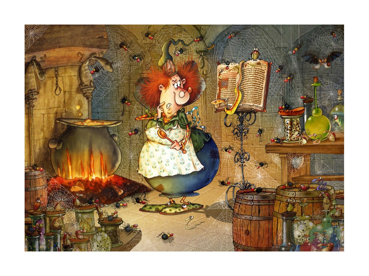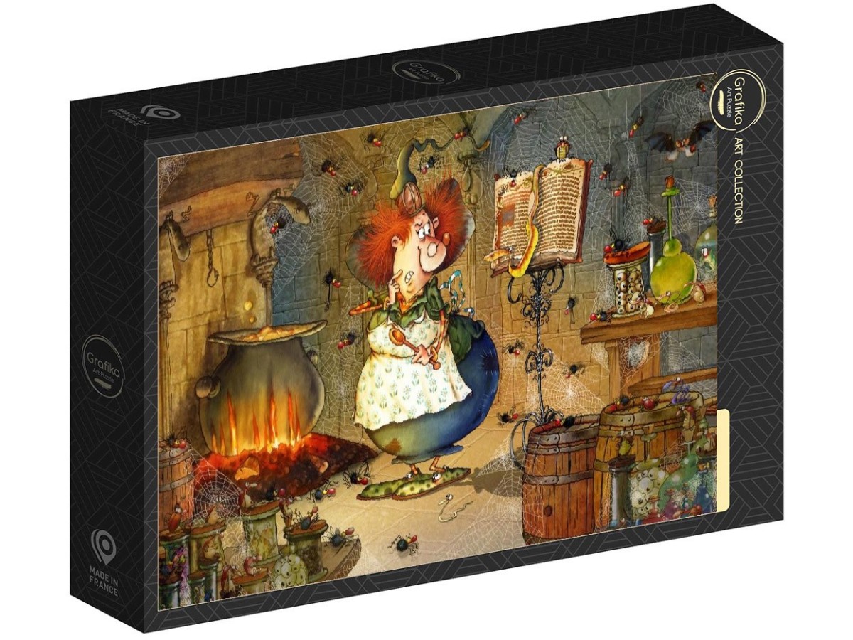 Imaginea prezentată în puzzle-ul Grafika cu 500 de piese ilustrează o scenă dintr-o poveste de basm. În centrul compoziției, o vrăjitoare cu părul roșcat și îmbrăcată într-o rochie albă cu sort verde pregătește o poțiune într-un ceaun mare, plasat pe foc. În jurul ei, camera este plină de obiecte magice și recipiente cu ingrediente diverse, de la sticle cu lichide colorate până la borcane cu plante și ciuperci. Întreaga scenă este animată de detalii amuzante și elemente fantastice, precum o mătură zburătoare și un șarpe care se încolăcește în jurul unui suport de lumânări. Pereții sunt decorați cu diferite instrumente magice și icoane, adăugând un plus de mister și farmec scenei. Este evident că ilustrația încearcă să captiveze și să stârnească imaginația privitorului, fiind extrem de bogată în detalii și culori vibrante.