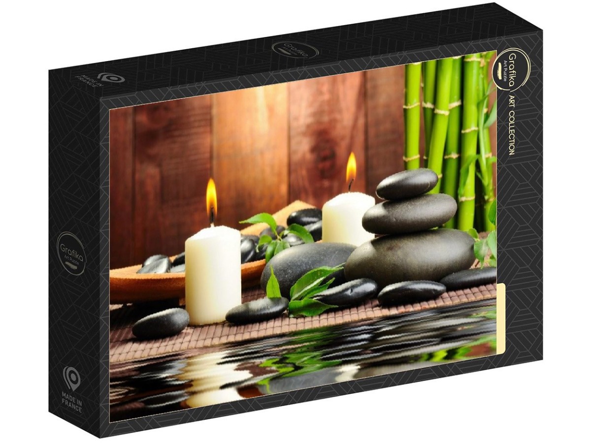 Imaginea acestui puzzle cu 500 de piese Grafika - Zen (Grafika-F-32274) surprinde o scenă tipică de relaxare și meditație, inspirată de estetica Zen. În prim-plan, putem observa un aranjament metodic de pietre negre, netede, cunoscute sub numele de pietre Zen, suprapuse una peste alta. Lumina caldă a două lumânări albe completează atmosfera de calm și concentrare, iar tulpinile verzi de bambus din fundal adaugă un contrast natural și vibrant. Reflecția elementelor în apa liniștită aduce o dimensiune suplimentară de adâncime și simetrie, întregind această compoziție simplă, dar profundă, care invită la introspecție și liniște.