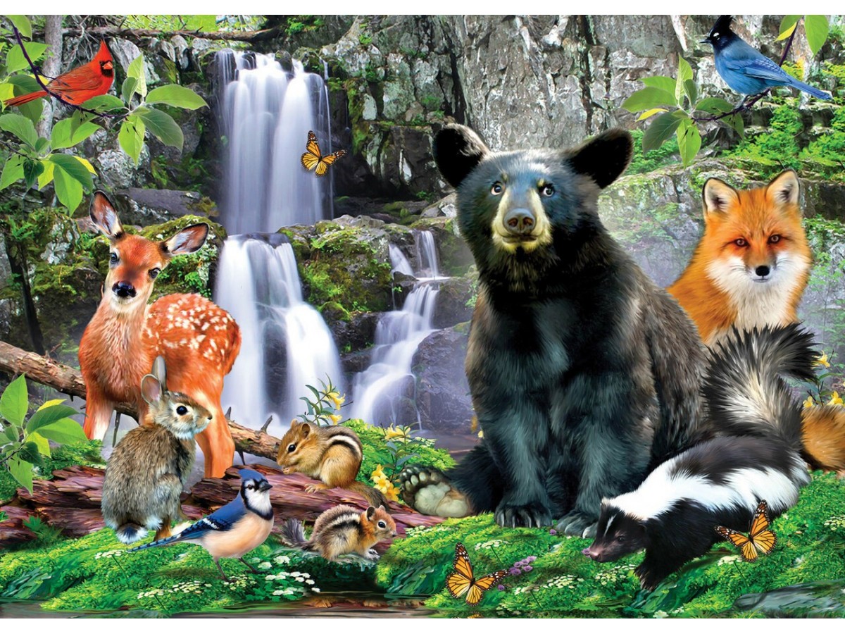 Imaginea prezintă o scenă vibrantă de pădure, animată de o varietate de animale sălbatice în mediul lor natural. Un urs negru mare este plasat central, stând în picioare pe o stâncă, cu cascada lină în fundal care adaugă un element de prospețime și puritate scenei. Alături de urs, o vulpe roșcată și un căprioară cu pete albe sunt de asemenea remarcabile, completând compoziția animată. Această ilustrație include, de asemenea, imagini ale unor animale mai mici, cum ar fi un arici, o veveriță, și câteva fluturi colorați, care zboară în jurul fructelor și florilor viu colorate. Scena este înconjurată de copaci bogat verzi și păsări cântătoare, adăugând un sentiment de viață și dinamism.