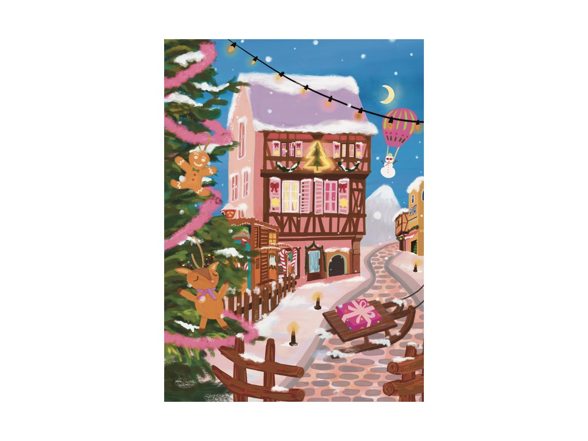 Imaginea ilustrează o scenă festivă de iarnă într-un orășel european, posibil inspirat de piața de Crăciun din Colmar, Franța, cunoscută pentru arhitectura sa colorată și atmosfera pitorească. În prim-plan, o casă tradițională alsaciană cu pereți din bârne de lemn și ferestre iluminate sugerează căldura și ospitalitatea locului. Strada pavată cu piatră și bordurată de garduri din lemn este acoperită parțial de zăpadă, creând o atmosferă de basm. În fundal, un balon cu aer cald zboară pe cerul înstelat și luminat de o lună plină, adăugând un element de aventură și visare la scena idilică. Copaci de Crăciun împodobiți și figurine de turtă dulce suspendate contribuie la decorul sărbătoresc, în timp ce o sanie cu un cadou mare roz așteaptă lângă o poartă.