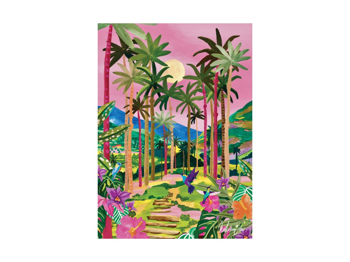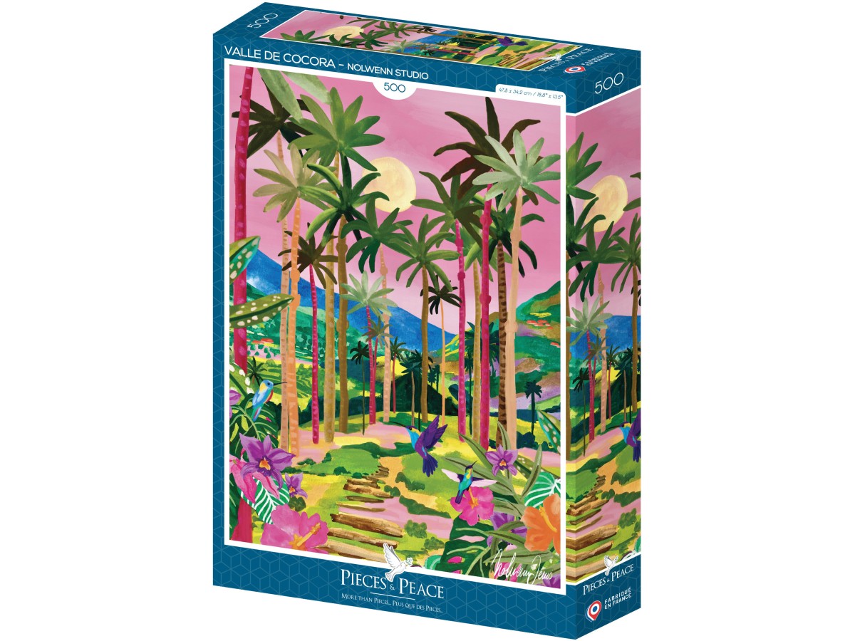 Ilustrația colorată a acestui puzzle cu 500 de piese Pieces & Peace redă o scenă tropicală vibrantă, posibil inspirată de Cocora Valley, cunoscut pentru peisajele sale pitorești și liniștitoare. În compoziție, diverse specii de palmieri înalți domină fundalul, întinzându-se spre cerul rozaliu în care plutește un disc solar pal. Sub copertă vegetală, un potec dintre multitudinea de flori și frunze tropicale ghidază privirea spre adâncul văii. Culorile folosite variază de la nuanțe suave de verde la roz, mov și galben, creând un contrast plăcut și o atmosferă de basm. Această ilustrație digitală aduce un omagiu naturii luxuriante și biodiversității unei jungle tropicale.
