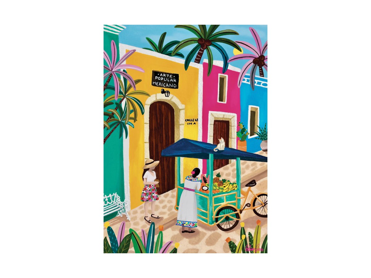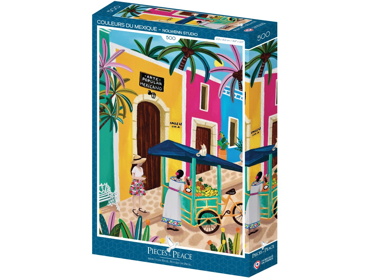 Imaginea puzzle-ului cu 500 de piese Pieces & Peace - Nolwenn Studio: Colors of Mexico surprinde o stradă vibrantă dintr-un oraș mexican, ilustrând viața plină de culoare și cultura locală. Clădirile sunt pictate în culori vii precum roz, galben și albastru, fiecare având uși de lemn și ferestre ornamentale. Pe stradă se pot observa diverse personaje, inclusiv o femeie în costum tradițional care vinde fructe dintr-un căruț tras de bicicletă. Palmele și un cer albastru intens completează peisajul tropical, oferind o perspectivă optimistă asupra vieții urbane din Mexic.