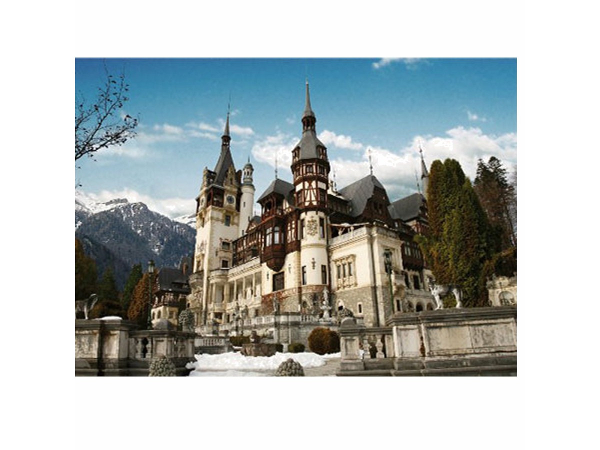 Fotografia surprinde Castelul Peleș, una dintre cele mai cunoscute atracții turistice din România, aflat în orașul Sinaia. Într-o zi de iarnă, zăpada acoperă grădinile și treptele ce duc spre intrarea principală. Cu acoperișurile înalte și turnurile ascuțite, castelul în stil neorenaștere germană impresionează prin arhitectura ornamentală bogată, ce îmbină lemnul, piatra și metalele într-un mod armonios. Munții acoperiți de zăpadă completează peisajul, creând o atmosferă de basm.