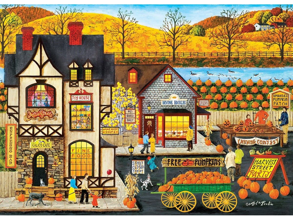 Imaginea puzzle-ului Master Pieces cu 500 piese XXL, intitulat „Harvest Street Party”, surprinde o scenă vibrant colorată de toamnă. Ilustrația detaliată înfățișează o stradă aglomerată cu oameni ce participă la activități specifice sezonului, cum ar fi cumpărarea de dovleci și decorarea acestora. În prim-plan, două clădiri pitorești gazduiesc magazine locale, cu semne ce indică vânzarea de plăcinte și băuturi de sezon. Pe fundal, câmpuri largi acoperite de dovleci și copaci în culorile toamnei completează atmosfera festivă a scenei. Un element rural și autentic, precum o caravană trasă de un cal, adaugă farmec compoziției.