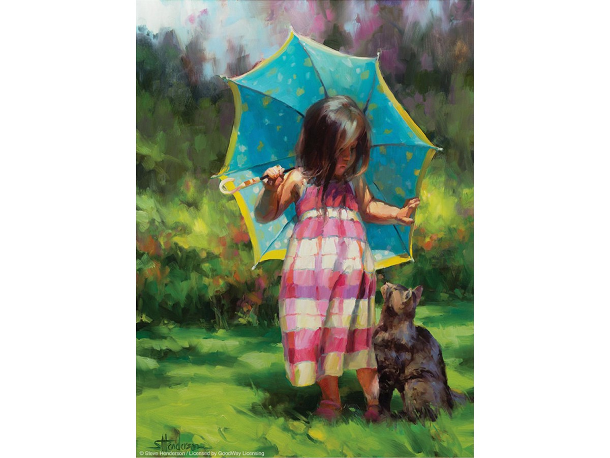 Imaginea acestui puzzle SunsOut de 500 de piese XXL capturează o scenă idilică în aer liber. O fetiță mică, îmbrăcată într-o rochie cu dungi roz și albe, ține deasupra capului o umbrelă mare de culoare turcoaz cu puncte albastre luminoase. Alături de ea, pe iarbă, se află un câine de talie mică, cu blană închisă la culoare, care pare să o însoțească și să participe la momentul de joacă. În fundal se disting vegetația luxuriantă și pete de lumină ce trec prin frunziș, creând o atmosferă caldă și plăcută.