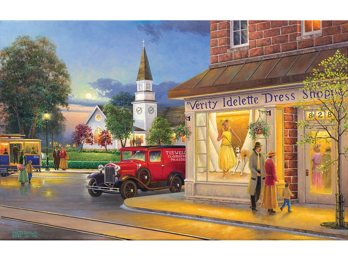 Imaginea reprezintă o stradă animată dintr-un oraș mic, cu accente ale perioadei interbelice, având un aer nostalgic și calm. Vedem o stradă pavată, umedă, probabil după o ploaie recentă, iluminată de luminile calde ale unei serii de toamnă. Pe partea stângă, un magazin cu numele ‘Verity Idellete Dress Shop’ expune în vitrină manechine elegante îmbrăcate în rochii de epocă. În fața magazinului, un grup de trei persoane, două femei și un bărbat, examinează cu interes vitrina. Pe fundal, se distinge un turn de biserică, care adaugă un caracter pitoresc scenei. Pe stradă, un automobil vechi de culoare roșie și o camionetă galbenă adaugă o notă de autenticitate și dinamism. Imaginea este o pictură în stil realist, care capturează atmosfera urbană a unei epoci apuse.