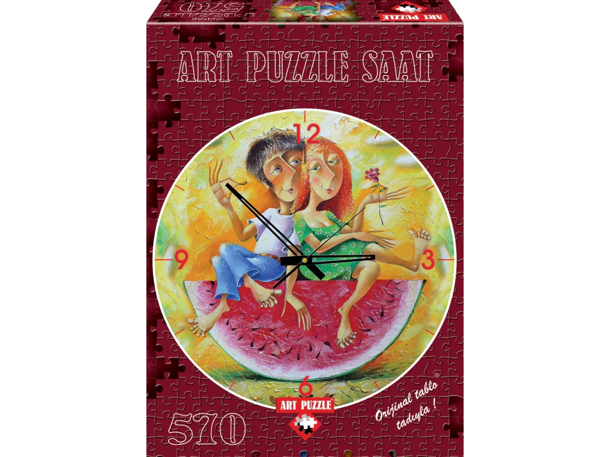 Imaginea puzzle-ului prezintă un ceas stilizat, sub forma unei picturi colorate, exemplificând o scenă romantică. Doi tineri, probabil într-o relație de dragoste, sunt pictați în centrul ceasului, înconjurați de cifre stilizate care marchează orele. Femeia, cu părul roșu, poartă o rochie albastră și este așezată pe genunchii partenerului său, care este îmbrăcat într-o cămașă cu dungi și pantaloni albaștri. Ambii privesc afectuos unul către celălalt, creând o atmosferă intimă și personală. Ceasul înseamnă metaforic probabil trecerea timpului în relația lor. Stilul artistic este vibrant și plin de culoare, cu un accent puternic pe expresiile faciale ale personajelor și pe detaliile vestimentare.