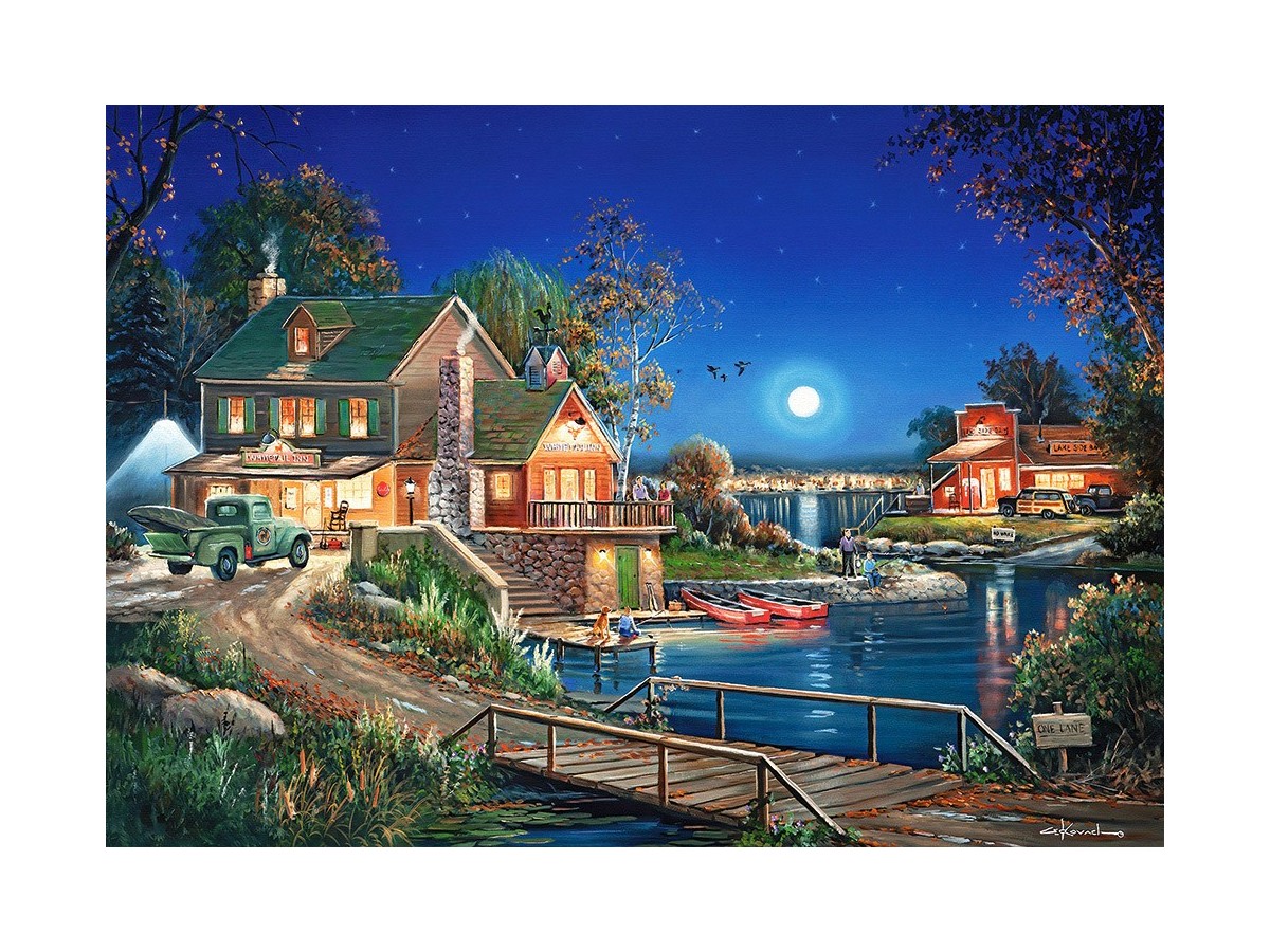 Această pictură scenică captează un peisaj pastoral la lumina lunii, combinând elemente arhitecturale cu natura. Imaginea este dominată de o casă mare, tipică stilului rustic, situată într-un cadru pitoresc. În fața casei, un drum ne duce la un pod de lemn ce traversează un mic curs de apă, reflectând lumina argintie a lunii. Pe partea dreaptă, o mică benzinărie adaugă un touch de viață cotidiană în acest peisaj altfel liniștit. Scena este animată și de prezența unei bărci ancorate în apropierea malului. Vegetația luxuriantă, cu copaci înfloriți și frunze dense, umple restul peisajului, conferind un simț de plenitudine și bogăție naturii.
