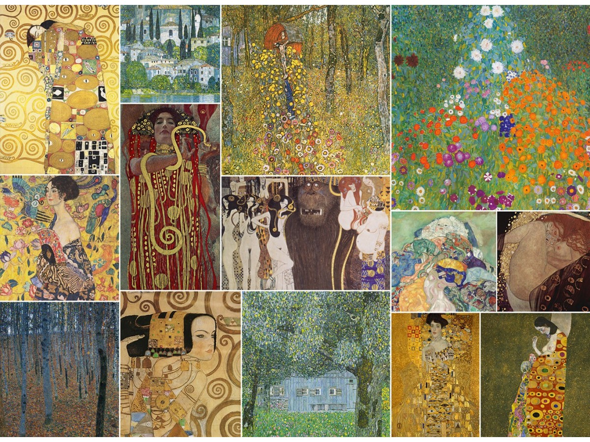 Colajul prezentat este cunoscut ca fiind o compilație de lucrări realizate de Gustav Klimt, un artist emblematic pentru curentul Art Nouveau. Acest colaj include variate scene, de la portrete stilizate până la peisaje împodobite cu detalii aurii și mozaicuri viu colorate. Fiecare segment al colajului surprinde eleganța și detaliul rafinat, caracteristice lucrărilor lui Klimt, manifestând o predilecție pentru forme organice și elemente decorative complexe. Culorile predominante sunt nuanțe de auriu și verde, interspărsate cu albastru și roșu, care adaugă o dimensiune vibrantă întregii compoziții. Stilul artistic al colajului este Art Nouveau, recunoscut pentru liniile fluide și formele inspirate din natură, văzute clar în modul de reprezentare al figurilor umane și în ornamentele decorative.