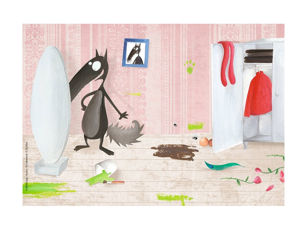 Ilustrația puzzle-ului Ravensburger - Loup, 2x12 piese (07627) surprinde un lup antropomorf într-o scenă haotică de interior. Lupul negru pare surprins în timp ce ține un ou spart într-o mână și deschide ușa unui frigider de unde au căzut diverse legume. Fondul roz cu modele florale și fereastra care lasă să pătrundă lumina completează atmosfera amuzantă a ilustrației.