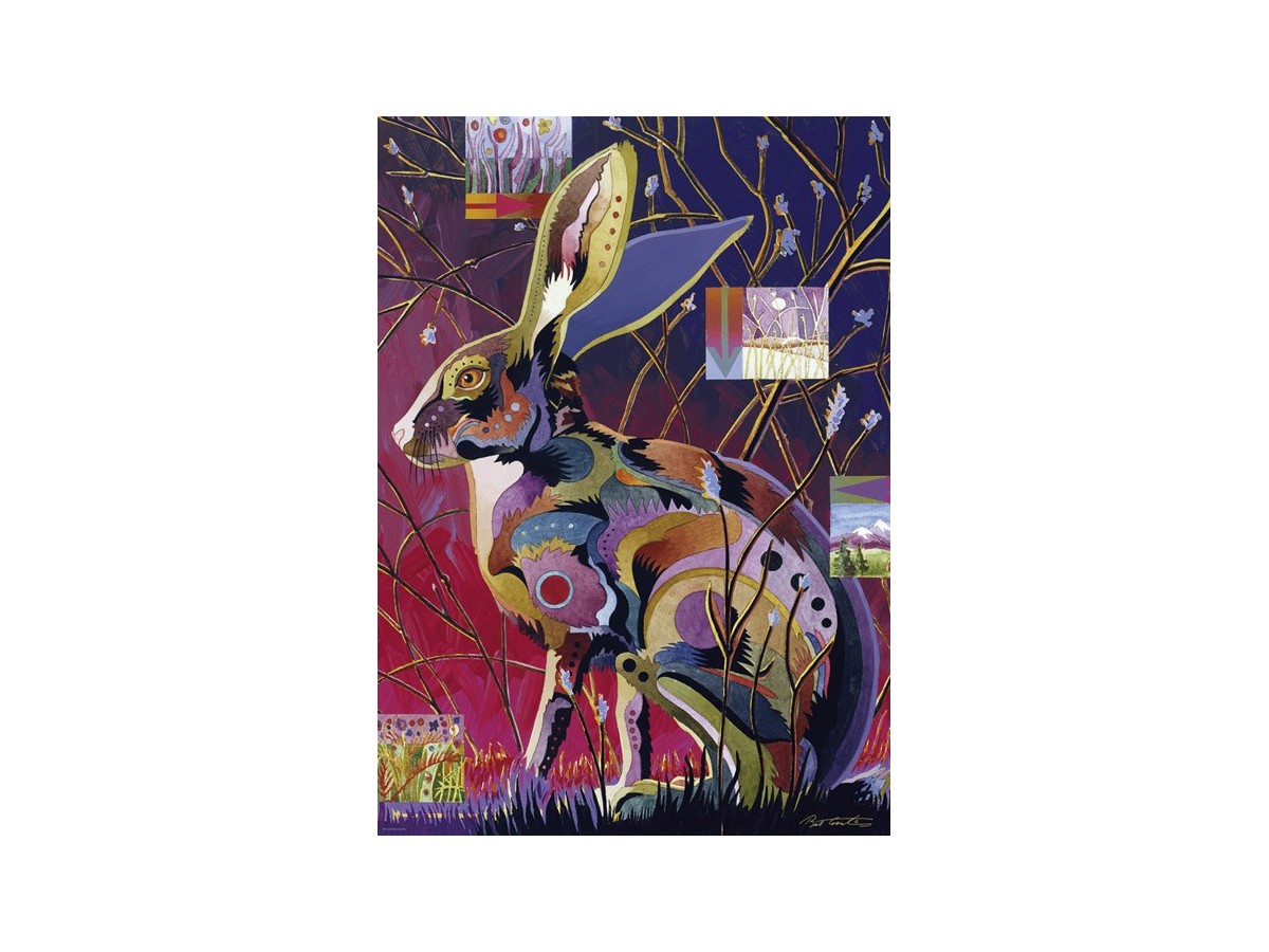 Această ilustrație vibrantă, realizată de Bob Coonts, intitulată 'Ever Alert', prezintă un iepure mare și colorat așezat într-un peisaj fantastic. Fundalul este compus din nuanțe intense de violet și roșu, în timp ce vegetația densă și detaliile florale adaugă un sentiment de mister și bogăție vizuală. Iepurele, reprezentat cu un grad ridicat de detalii stilizate și ornamente tribale, domină compoziția. Această pictură deosebită combină elemente naturale cu un stil aproape surreal, îmbogățind scena cu o gamă largă de texturi vizuale.