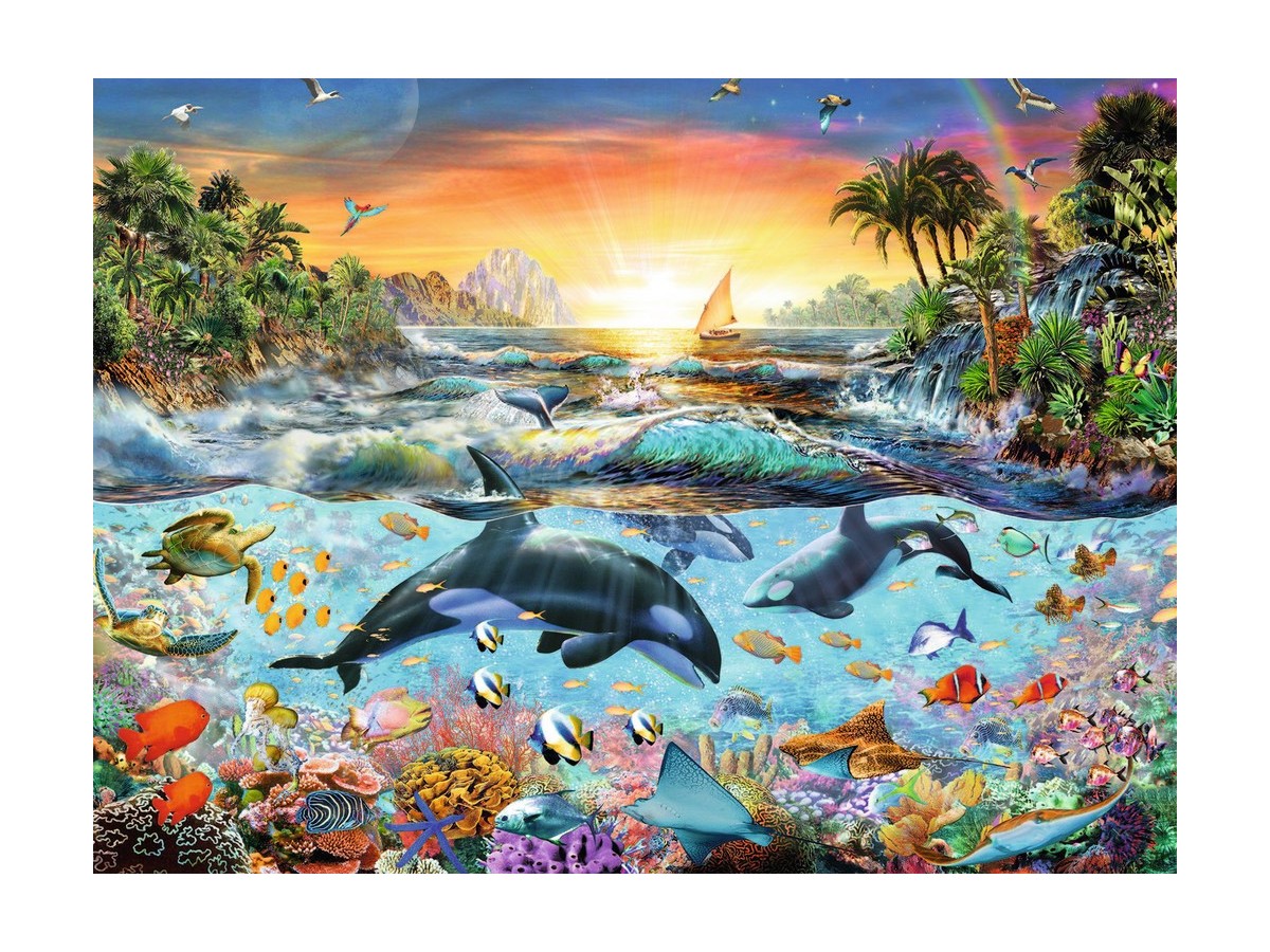 Ilustrația puzzle-ului Ravensburger - Paradisul Delfinilor, cu 200 piese, surprinde un peisaj marin vibrant, unde delfinii joacă un rol central într-o scenă spectaculoasă. Sub apă, reciful coral este bogat în detalii, fiind locuit de o varietate de pești tropicali, stele de mare și plante subacvatice. Deasupra apei, palmierii, cascadele și apusul de soare crează o atmosferă de paradis. În fundal, muntele și pădurea tropicală completează această imagine exuberantă.