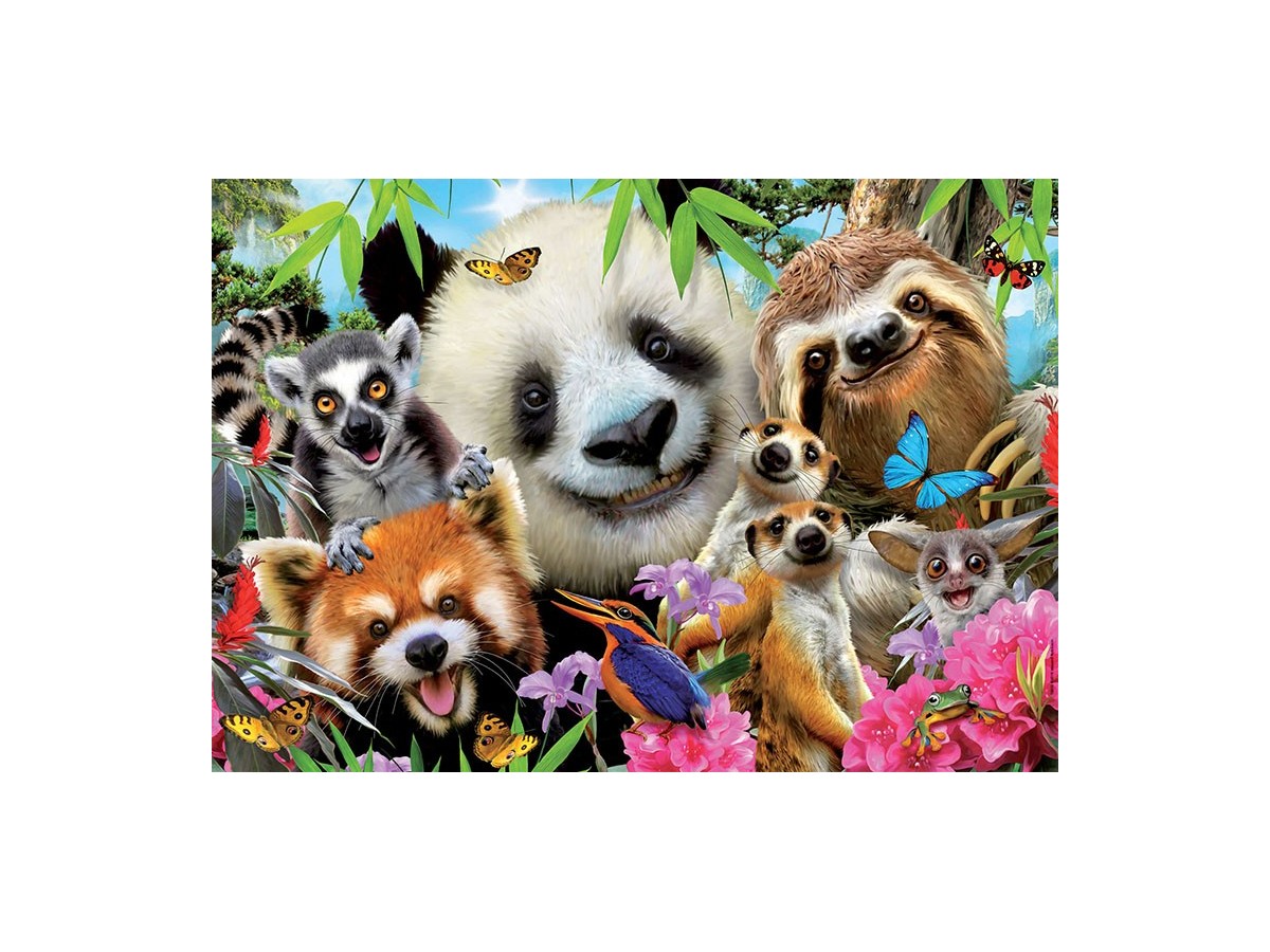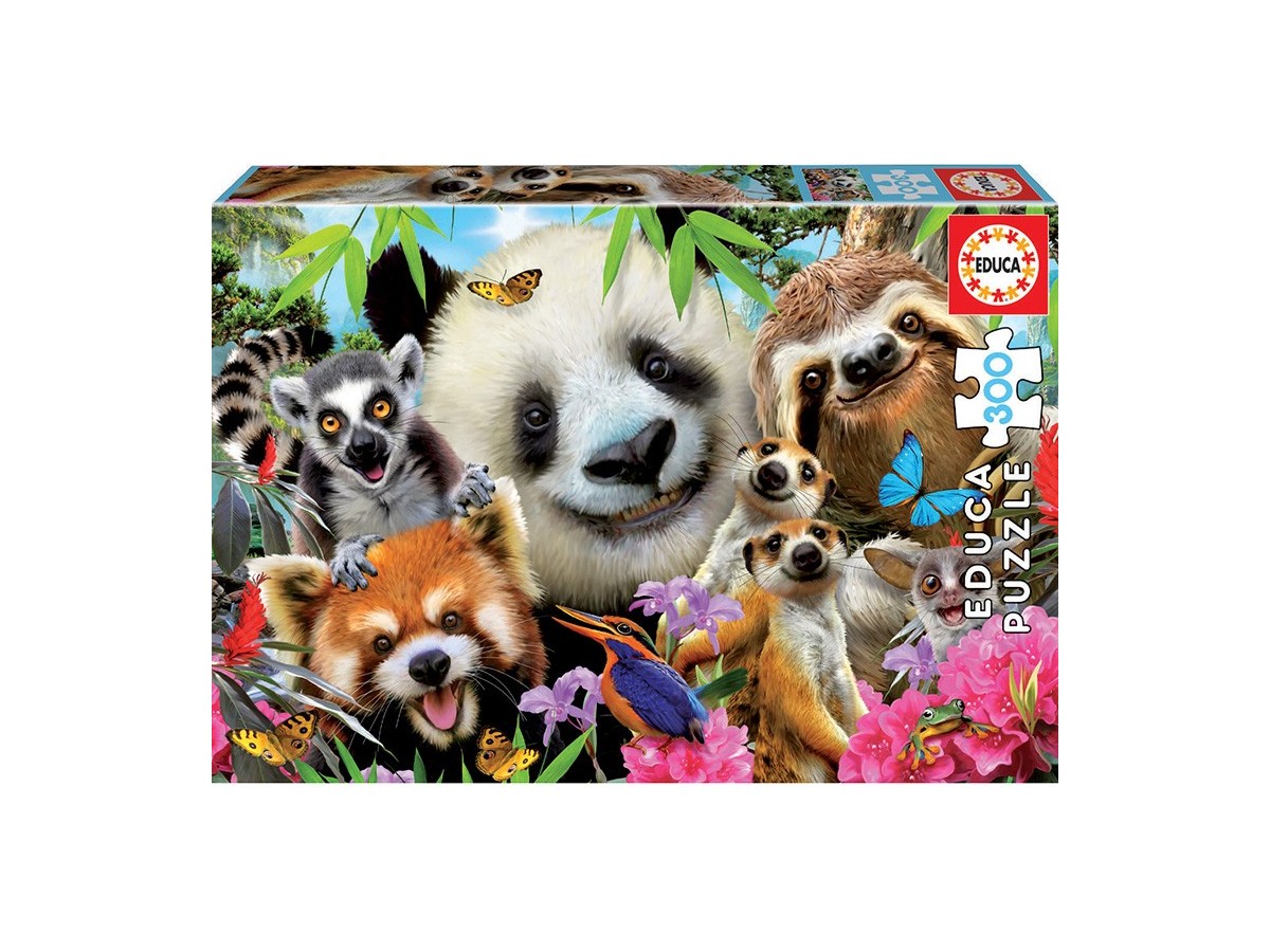Imaginea acestui puzzle, intitulat Black-Eyed Friends Selfie, 300 piese (18610) de la brandul Educa, surprinde un grup amuzant de animale sălbatice care par să facă un selfie împreună. Un pui de panda cu ochii mari și zâmbet blând este în centrul atenției, înconjurat de un leneș, un coati, un raton și un pui de loris, fiecare cu expresii vesele și prietenoase. Fundalul este plin de viață, cu o junglă luxuriantă, flori colorate și fluturi zburători, adăugând un aer vibrant și dinamic compoziției.