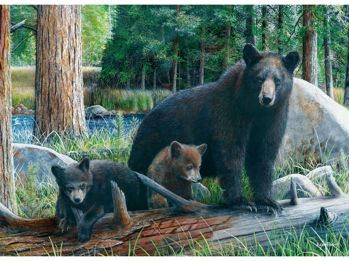 Imaginea redă o scenă naturală idilică, în care un urs adult este însoțit de doi pui de urs într-o pădure densă, lângă un mic curs de apă. Fundalul este dominat de copaci înalți și o vegetație bogată, tipică unui habitat forestier nord-american. Ursul mare stă în picioare, privind direct spre privitor, în timp ce puii săi se joacă aproape de el, unul dintre ei explorând un trunchi de copac căzut. Această ilustrație în stil realist surprinde detaliile blănii animalelor și textura mediului natural, oferind o imagine plină de autenticitate și detaliu.