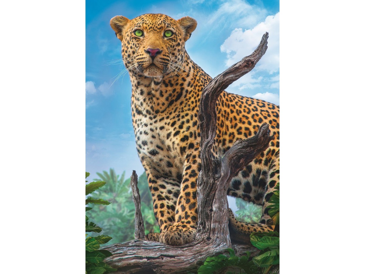 Imaginea puzzle-ului Trefl - Leopard, 500 piese (37332) surprinde un leopard adult în habitatul său natural, cu o junglă densă sau o pădure tropicală în fundal. Animalul stă pe o ramură groasă de copac, având o postură atentă și o privire intensă îndreptată spre privitor. Detaliile fizice ale leopardului sunt redacte cu precizie, evidențiind modelul distinctiv al blănii și expresia vie a feței.