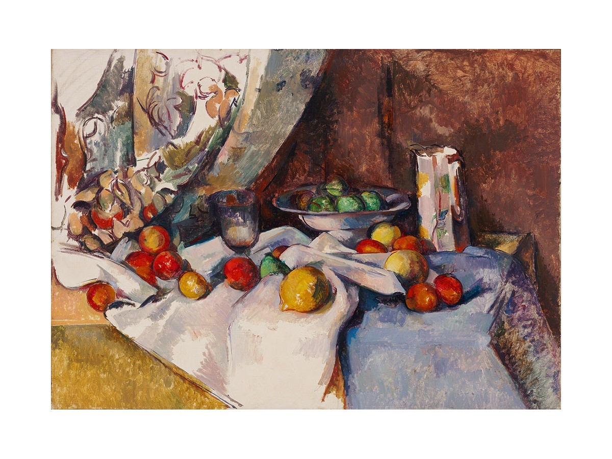 Această pictură, intitulată 'Still Life with Apples', a fost creată de Paul Cézanne între anii 1895 și 1898. Opera ilustrează o natură statică cu fructe, predominant mere și portocale, așezate pe o masă acoperită cu o pânză albă. Pe masă se află și un vas gri cu capac, plasat aproape de centrul compoziției, și un pachet de țigarete, atribut ce adaugă un element modern compoziției tradiționale de natură statică. Culorile folosite sunt calde, predominând nuanțele de maro, roșu, galben și ocazional verde, punctând astfel diversitatea cromatică a fructelor.