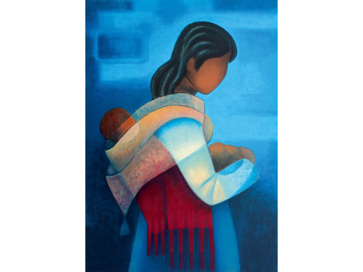 Lucrarea 'Manuella' de Toffoli Louis, realizată în 1994, prezintă o scenă calmă și plină de căldură umană. În această pictură, o femeie este văzută de la spate, purtând un copil într-un shawl mare, colorat. Femeia, cu părul lung și negru, prins într-o coadă, se distinge prin îmbrăcămintea sa simplă, dar colorată cu tonuri de albastru și roșu. Fundalul este realizat în nuanțe calme de albastru, cu linii subtile ce par să sugereze contururi arhitecturale sau forme abstracte, conferind picturii un aer misterios și introspectiv.