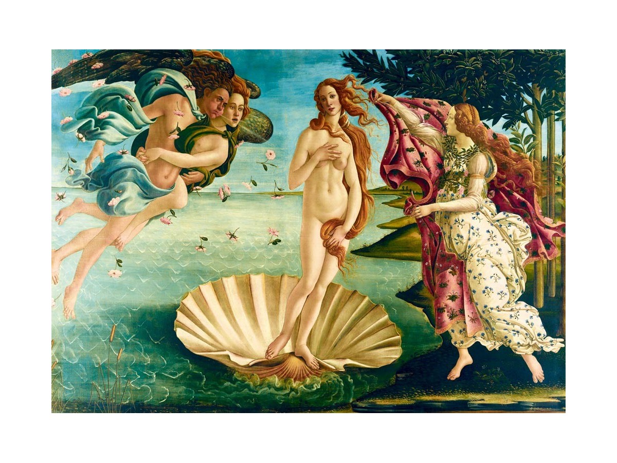 Această pictură intitulată Nașterea lui Venus a fost creată de artistul Sandro Botticelli în jurul anului 1485. Este o operă iconică a Renașterii care ilustrează momentul în care Venus, zeița frumuseții, emerge din mare pe o scoică. Compoziția este dominată de figura centrală a Venerei, prezentată nud, cu o postură grațioasă și părul lung și ondulat acoperindu-i parțial corpul. În stânga tabloului, două figuri – Zefirul și Aura – o aduc pe Venus înspre mal, suflând vânt și mărind dinamismul scenei cu mici valuri și spumă. În dreapta, una dintre Ore, dea primăverii, se pregătește să o îmbrace pe Venus cu o mantie intricată, decorată cu flori de primăvară.