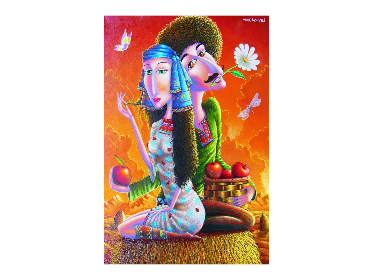 Această pictură colorată prezintă două personaje stilizate într-un decor vibrant, posibil inspirat din arta populară. Un bărbat cu un profil alungit, cu nasul mare și mustața subțire, ține o floare albă în mână, sugerând o ofertă de pace sau o tentativă de curtare. Femeia, cu părul albastru și îmbrăcămintea decorată cu motive florale, se uită spre el cu un gest grăitor, ținând un măr în mână, ceea ce poate simboliza ispită sau tentație. Fundalul este asemănător cu un apus de soare, cu tonuri calde de roșu și portocaliu, punctat de elemente naturaliste cum ar fi fluturi și fructe.