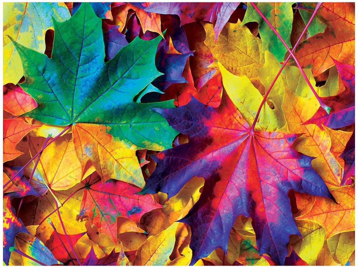 Imaginea puzzle-ului Master Pieces - Fall Frenzy, cu 550 piese, surprinde o compoziție colorată de frunze de toamnă, în nuanțe vibrante de roșu, galben, portocaliu și verde. Fiecare frunză este detaliată, evidențiind texturile și nervurile naturale, reflectând diversitatea și frumusețea schimbărilor sezoniere. Această ilustrație digitală capturează esența toamnei prin intensitatea și contrastul culorilor, oferind o perspectivă aproape macro a detaliilor fine ale frunzelor, creând un efect vizual aproape de un tapet decorativ plin de viață și culoare.