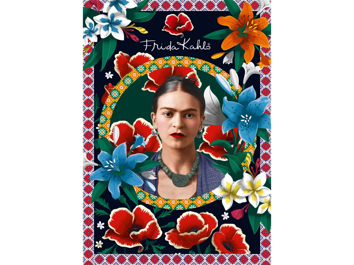 Acest puzzle cu 2000 de piese reprezintă o ilustrație digitală a celebrei artiste Frida Kahlo, una dintre cele mai emblematice figuri ale artei mexicane. Portretul intens al artistei, plasat central, este înconjurat de un fundal bogat decorat cu flori viu colorate și un cadru ornamental inspirat de motivele tradiționale mexicane. Frida este înfățișată cu o expresie serioasă, privind direct spre privitor, purtând o bluză tradițională și un colier masiv de jad, elemente recurente în portretele sale autohtone. Florile mari, de la crini la popi tropicali, adaugă un contrast vibrant, transformând portretul într-o celebrare a culturii și a patrimoniului mexican.