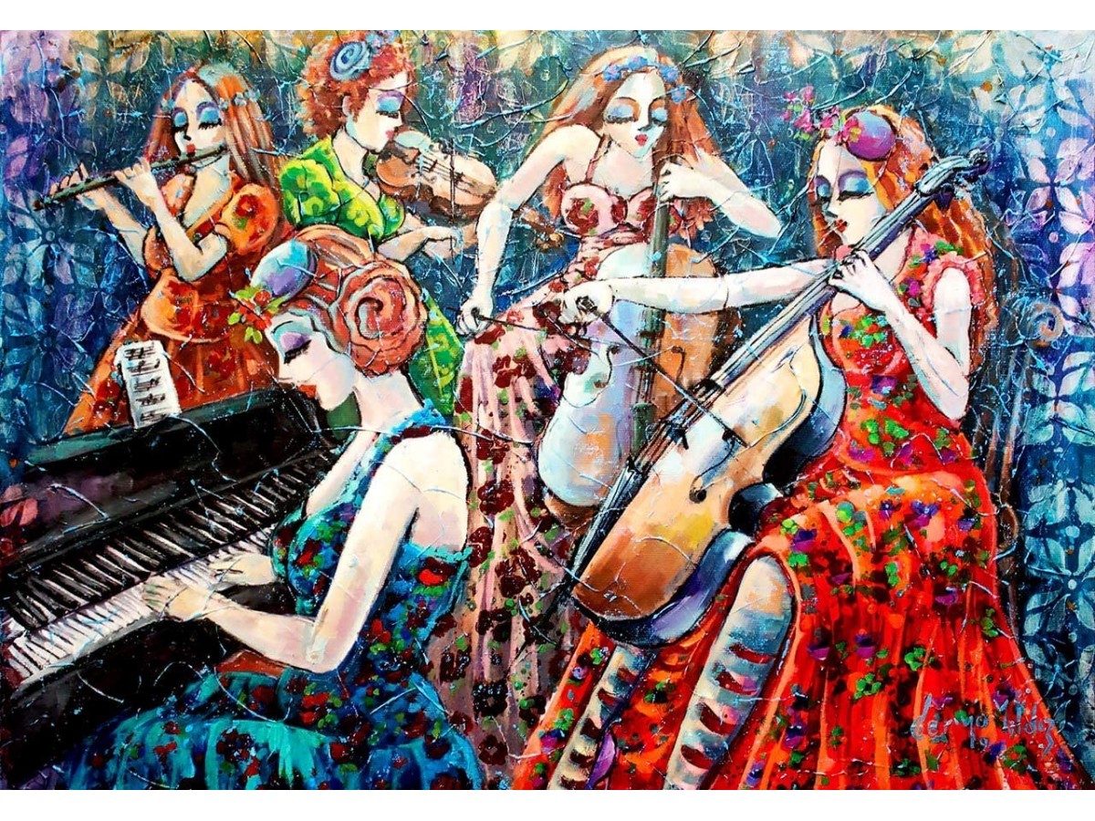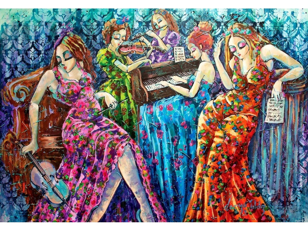 Ilustrația digitală descrie o serie de scene animate, pline de culoare și vitalitate, cu personaje feminine în ipostaze artistice. În prim-plan, o femeie cu părul roșu și ondulat este surprinsă cântând la un violoncel, îmbrăcată într-o rochie colorată, strălucitoare. O altă scenă îfățișează o femeie interpretând la pian, în timp ce notele muzicale par să prindă viață în jurul ei, sugerând mișcarea și ritmul muzicii. Alte personaje, de asemenea strălucitor îmbărcate, intensifică diversitatea și dinamica compoziției prin prezența lor activă în această celebrare a muzicii și a artei performative.