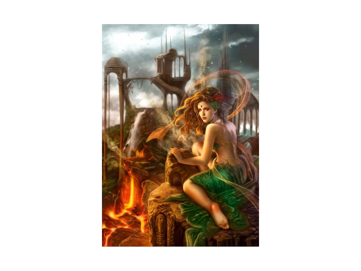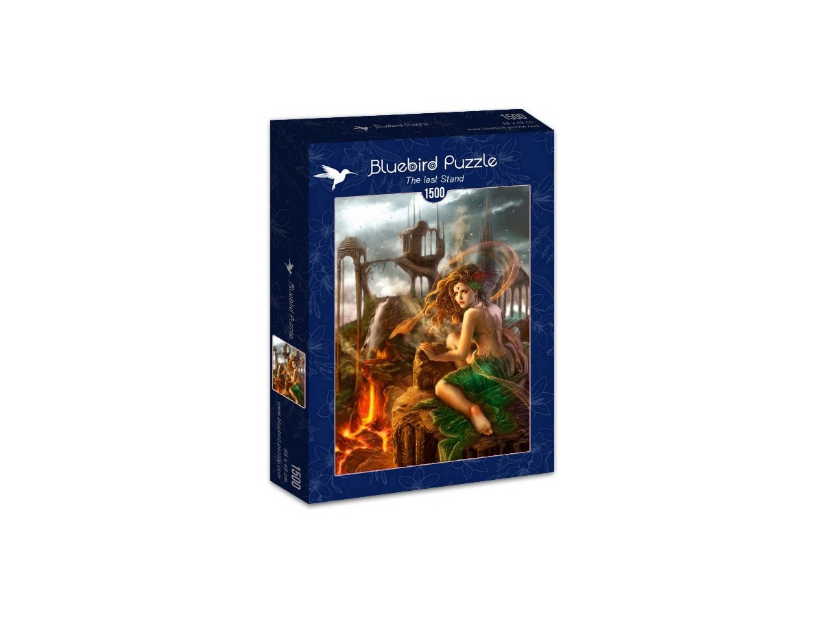 Imaginea reprezintă un puzzle cu 1500 piese de la brandul Bluebird, având o tematică mistică și post-apocaliptică. Ilustrația digitală prezintă o femeie cu aripi de zână, îmbrăcată într-o rochie lungă verde, șezând pe o structură de piatră într-un peisaj dominat de ruine arhitecturale și elemente naturale precum lavă și vegetație densă. Culorile predominante sunt verde, maro și roșu, creând o atmosferă enigmatică.