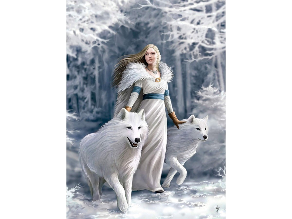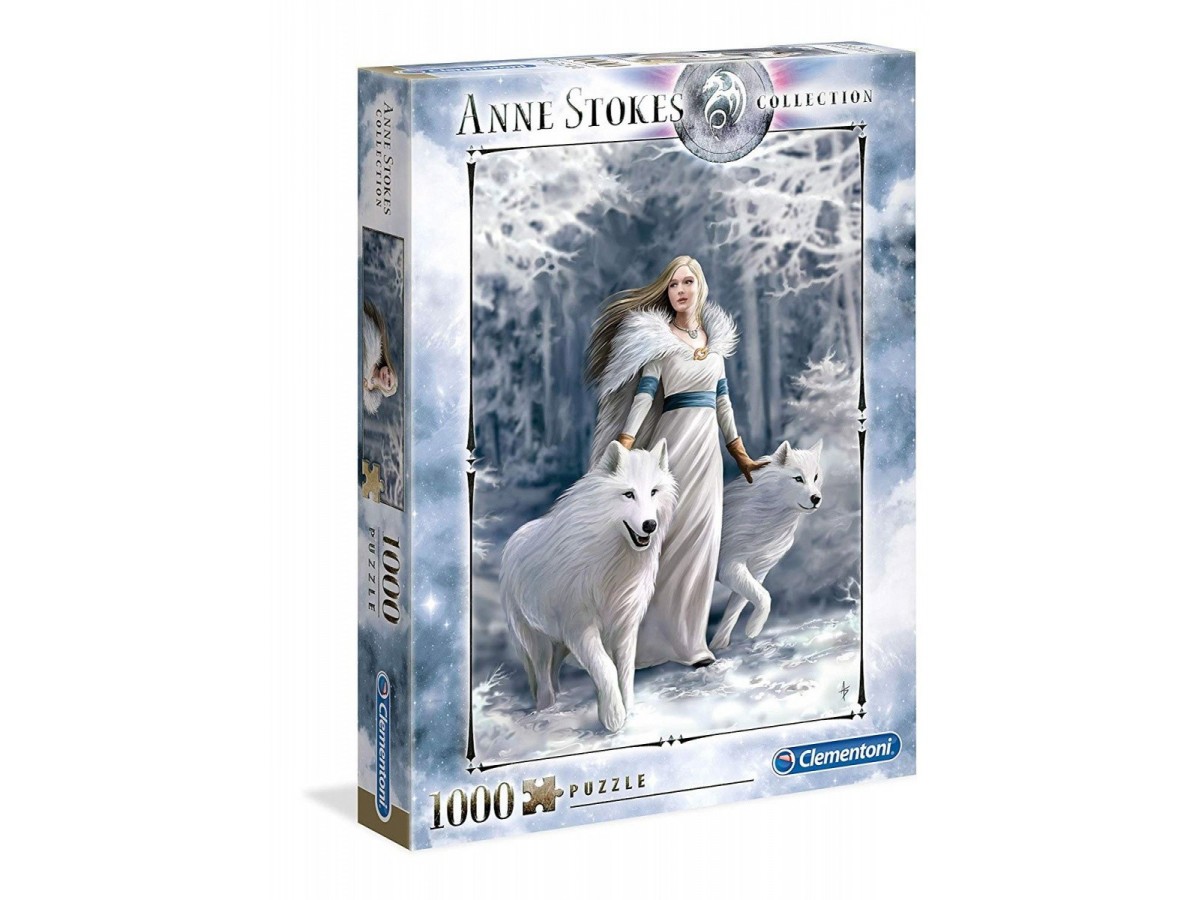 Imaginea puzzle-ului Clementoni - Anne Stokes: Guardians of Winter, 1000 piese (39477) prezintă o ilustrație digitală cu o femeie însoțită de doi lupi albi, desfășurându-se într-un peisaj iernatic presărat cu copaci acoperiți de zăpadă. Femeia, având părul blond și lung, purtând o rochie lungă și largă albă și o capă mănoasă din blană albă, este reprezentată cu calm și o anumită grație, sugerând o legătură apropiată cu lupii care o însoțesc. Atmosfera este una de liniște și frumusețe pură, tipică scenelor mitice sau fantastice. În fundal, copacii denși, încremeniți sub greutatea zăpezii, contribuie la crearea unei atmosfere de basm, într-o pădure ce pare nefrecventată de oameni.