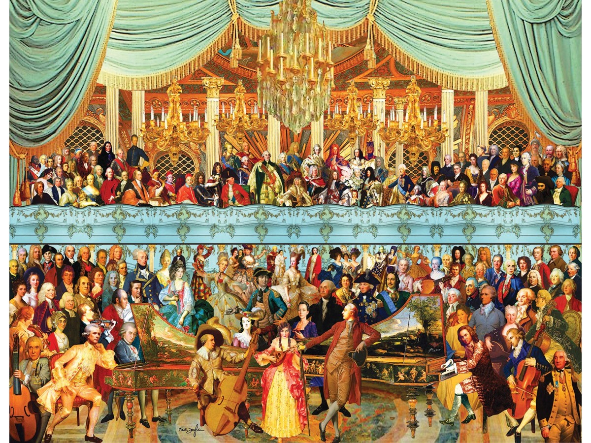 Imaginea puzzle-ului SunsOut - Neal Taylor: 18th Century History, 1000 piese, surprinde o încăpere vastă și opulent decorată, aparent un salon de bal din secolul al XVIII-lea, populat de Număroase personaje îmbrăcate în costume elaborate de epocă. Centrul compoziției este dominat de un cuplu care dansează, îmbrăcați în haine spectaculoase, sugerând o scenă de curte regală. Alte personaje, inclusiv muzicieni, nobili și dansatori, completează scena, fiecare detaliu fiind meticulos ilustrat pentru a reflecta moda și eticheta acelei perioade. Pictura, plină de culoare și detalii, evocă atmosfera festivă și opulența curților regale europene.
