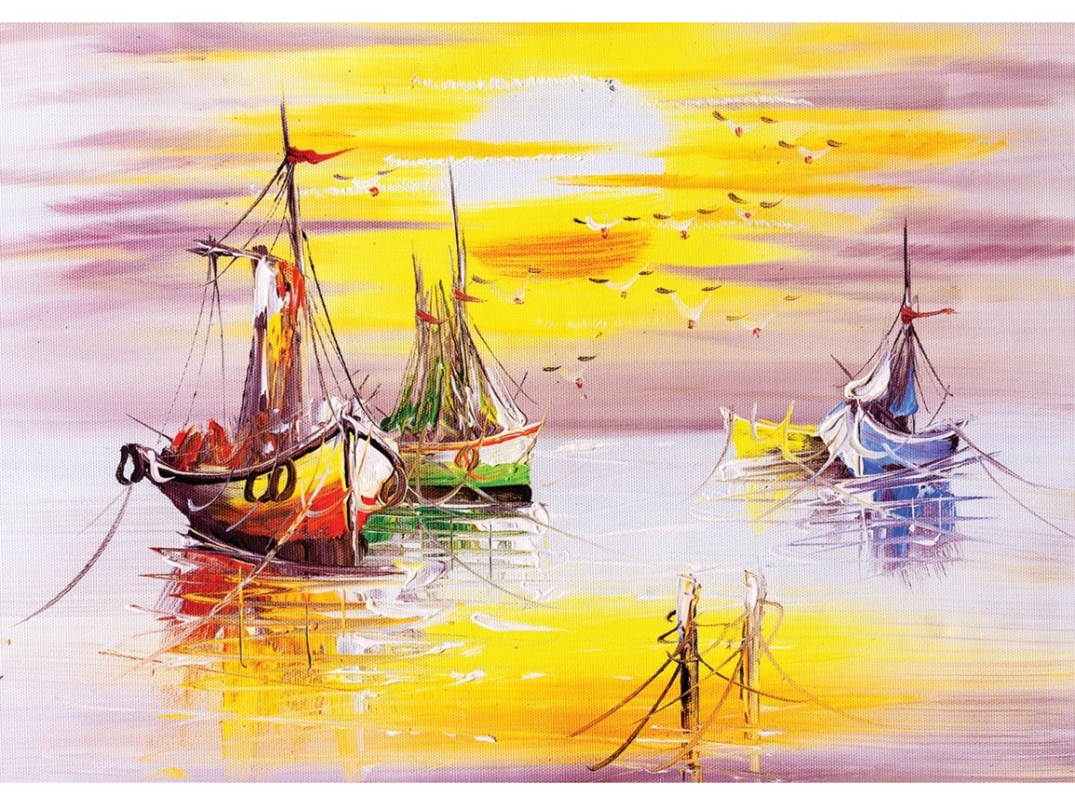 Acest puzzle cu 500 piese de la brandul Art Puzzle te va purta într-o călătorie relaxantă pe marea liniștită, sub un cer în nuanțe de galben și portocaliu, semn că se apropie apusul. În prim-plan, patru bărci cu pânze colorate (roșu, verde, albastru și galben) stau ancorate pe apele calme, reflectându-și frumusețea în oglinda apei. Lumina solară puternică și umbrele jucăușe adaugă profunzime și realism acestei scene marine impresioniste.