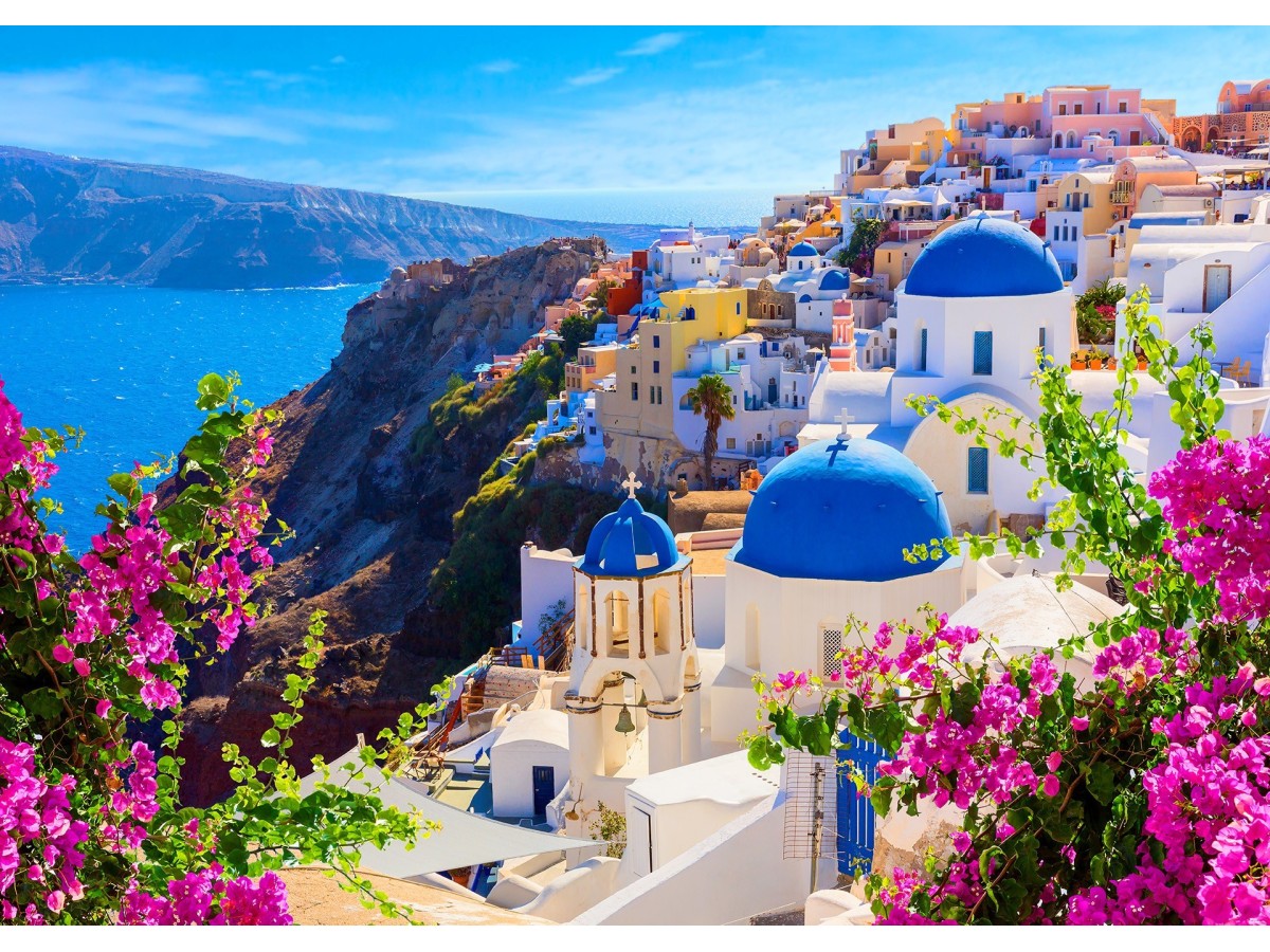 Puzzle 1000 piese Enjoy - Santorini View with Flowers, Greece + folii pentru lipit puzzle (Enjoy-5083)