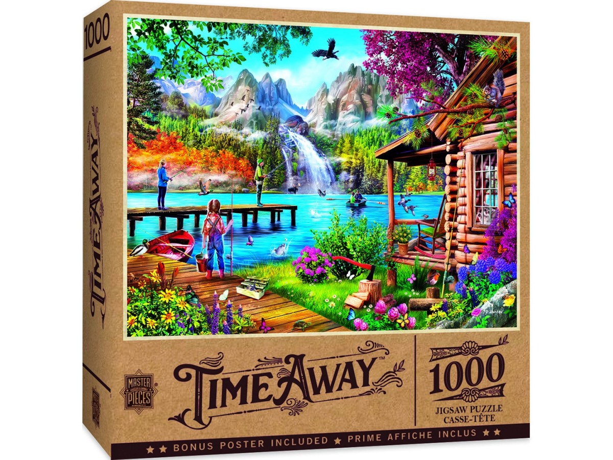 Scena reprezentată în puzzle-ul Fishing with Pappy de la brandul Master Pieces este o ilustrație colorată ce surprinde un peisaj pitoresc la marginea unei ape limpezi, posibil un lac de munte. Un bărbat în vârstă și un copil, aparent bunic și nepot, pescuiesc de pe un ponton de lemn. Copilul, cu o pălărie albastră, este concentrat asupra undiței, în timp ce bărbatul îl supraveghează cu mândrie. Pe fundal, munți înalți și cascade spectaculoase se varsă în lac, iar o căsuță din lemn, acoperită parțial de viță de vie, completează peisajul rustic.