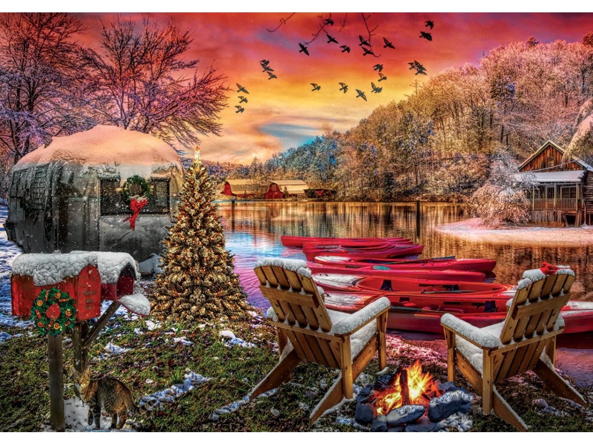 Imaginea puzzle-ului Caravan Camp de la Art Puzzle surprinde o scenă pitorească de iarnă, combinând elemente naturale cu decorațiuni festive. Două scaune de lemn sunt așezate față în față peste un covor de zăpadă, cu un foc de tabără aprins între ele, creând o atmosferă caldă și primitoare. Pe fundal, un lac înghețat este înconjurat de cabane din lemn și copaci îmbrăcați în zăpadă, sub un cer roșiatic de apus. Decorul este completat de caiace roșii așezate pe malul lacului și de un brad împodobit, situat între scaune, ce adaugă un strop de culoare și festivitate scenariului. Cerul este animat de zborul unui grup de păsări, adăugând dinamism compoziției.