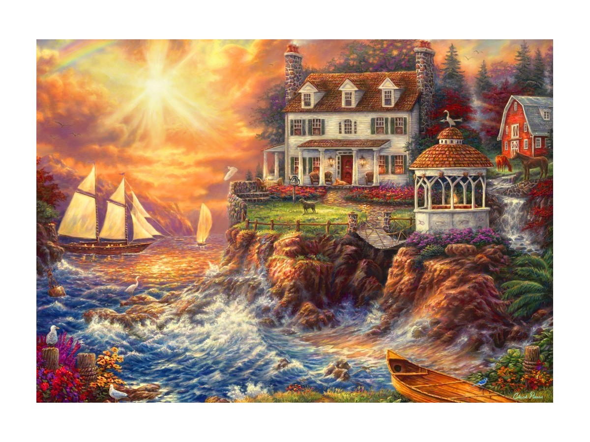 Imaginea prezintă o pictură vibrantă, realizată de artistul Chuck Pinson, numită 'Life Above the Fray'. Aceasta înfățișează o scenă pitorească la malul mării cu o casă impunătoare, construită în stil victorian, situată pe un promontoriu stâncos. Soarele strălucitor, aproape de asfințit, bănează întregul peisaj într-o lumină caldă, aurie, în timp ce mai multe bărci cu pânze se apropie de coastă. Natură este reprezentată în detaliu, cu flori colorate și vegetație bogată, care adaugă un contrast vibrant față de albastrul intens al mării agitate și spumegândă. Scena este completată de un foișor elegant, situat aproape de apă, și un mic vas parchează pe mal, gata pentru o plimbare pe mare.