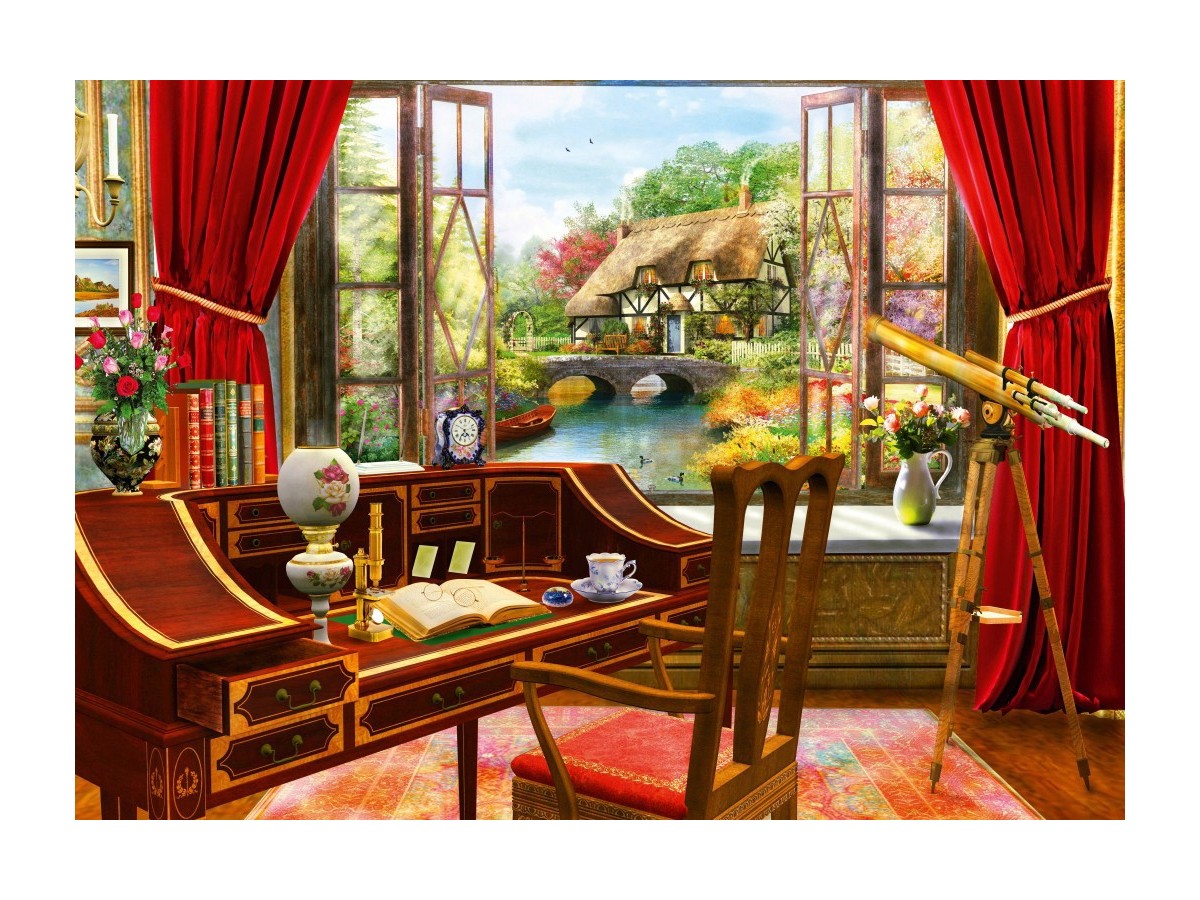 Imaginea ilustrează interiorul sofisticat și plin de culoare al unui birou clasic. La prim-plan se observă un birou victorian amplasat în fața unei ferestre mari. Pe birou sunt aranjate cărți vechi, o hartă desfășurată, un ceainic din porțelan și o lunetă bronzată, aceasta din urmă orientată spre exterior. Scena evocă o atmosferă de epocă, sugerând pasiunea pentru explorare și studiu. Dincolo de fereastră, se întrezărește un peisaj rural idilic, cu un pod de lemn care traversează un râu, iar în fundal, casele pitorești și copacii înfloriți completează un tablou pastoral. Pereții sunt ornamentați cu draperii roșii opulente, iar podeaua este acoperită cu un covor roșu cu modele florale. Fereastra și ușa deschisă permit luminii naturale să pătrundă în încăpere, creând un joc de lumini și umbre pe podeaua încăperii și pe suprafața lucioasă a mobilierului.
