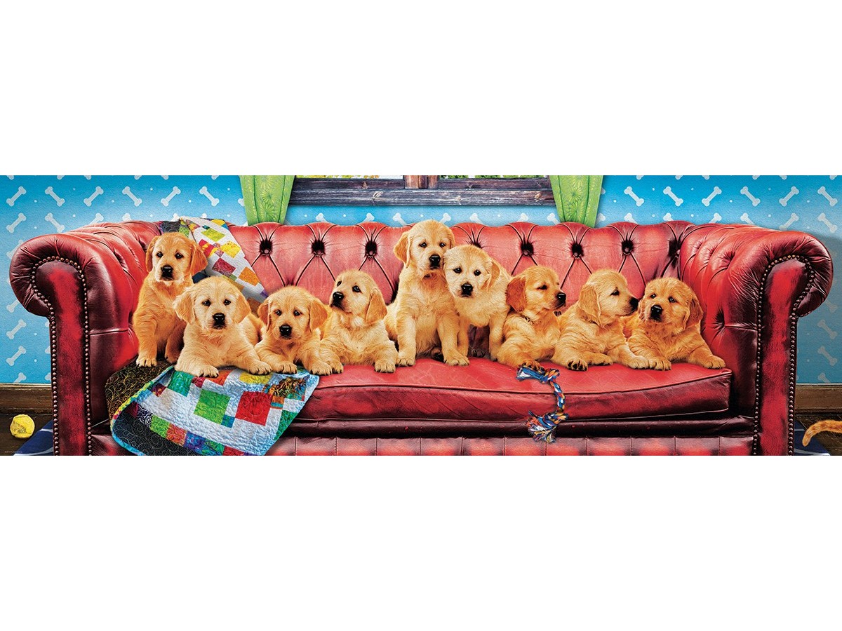 Imaginea puzzle-ului Eurographics - Lounging Labs surprinde un grup de câini Labrador pui aşezaţi pe o canapea roşie de tip vintage, în faţa unui perete albastru cu motive marine, reprezentând ancore albe. Canapeaua este impunătoare, elegantă, cu decoraţiuni elaborate, o pătură cu modele geometrice şi un os de jucărie pentru câini. Puii de Labrador, cu blana auriu deschis, exprimă curiozitate şi jovialitate, privind în diferite direcţii.