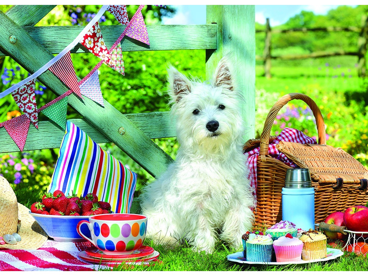 Imaginea acestui puzzle cu 500 de piese XXL de la Eurographics redă o ilustrație colorată cu un câine West Highland White Terrier într-o atmosferă de picnic plină de viață. Câinele este așezat pe o pătură de picnic, înconjurat de un coș tradițional plin cu alimente și veselă colorată, sub un cer senin de vară. În fundal, un gard de lemn și vegetație bogată completează scena, creând o imagine plină de detalii și culoare.