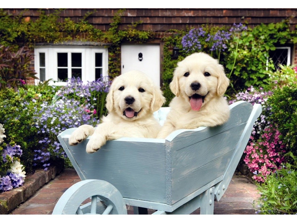 Imaginea infățișează doi cățeluși de culoare albă, așezați într-un căruț ușor din lemn, vopsit într-un albastru deschis. Ei se bucură de o zi însorită, fiind plasați în fața unei case primitoare, decorate cu flori în multiple culori. Fundalul este marcat de o varietate de plante și flori care înconjoară casa, creând un cadru pitoresc și vibrant. Aceasta pare a fi o fotografie care capturează momentul plăcut, punând accent pe expresiile vesele ale cățelușilor și pe atmosfera primăvăratecă ce înconjoară scena.