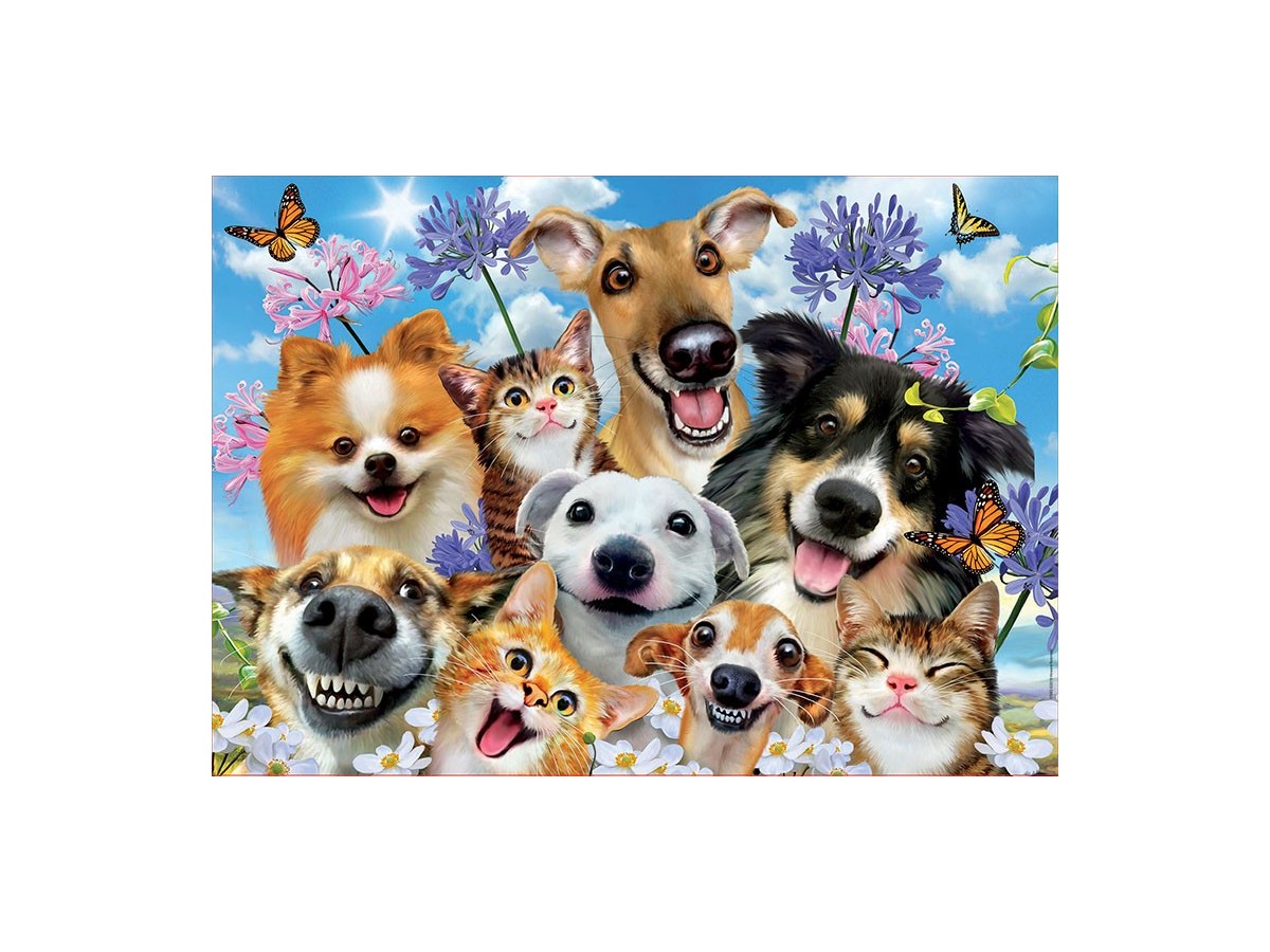 Imaginea puzzle-ului Educa - Fun In The Sun Selfie cu 500 de piese surprinde un grup divers de animale de companie, în special câini și pisici, alături de fluturi, surprinse într-o poziție veselă, ca și cum ar participa la o ședință foto. Fiecare animal afișează o expresie facială plină de viață și entuziasm, cu zâmbete largi și ochi strălucitori, contribuind la un aer general de bucurie și jovialitate. Scena este completată de un fundal viu colorat, reprezentând un câmp înflorit sub cerul albastru, care adaugă o notă de prospețime și naturalețe întregii compoziții. Fluturii adaugă un element de dinamism, sugerând o zi frumoasă de primăvară sau vară.
