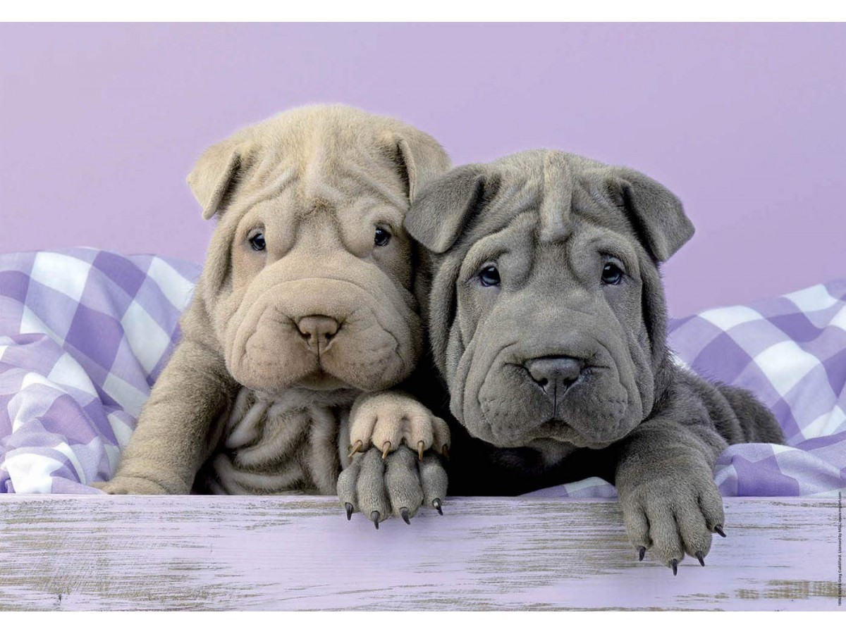 Imaginea ilustrează doi cățeluși adorabili, probabil de rasă Shar Pei, repauzând umăr la umăr. Fața lor distinctă, cu cute multe și plictisite și ochii mari, exprimă un aer de curiozitate juvenilă. Ambii pui sunt de culoare gri-albăstruie, contrastând frumos cu fundalul lila și cu perna cu dungi albe și lila pe care se odihnesc. Estompeza fină și textura detaliată indică faptul că aceasta este o fotografie, nu o pictură sau ilustrație.