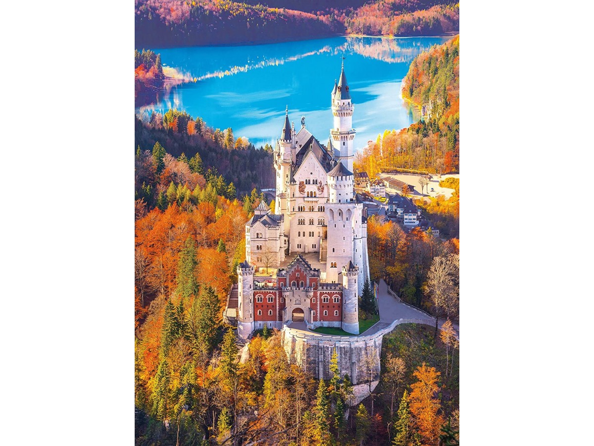 Imaginea puzzle-ului Clementoni Neuschwanstein Castle, cu 1000 de piese, surprinde în detaliu faimoasa construcție din sudul Bavariei, Germania. Castelul stă mândru în peisajul pitoresc, înconjurat de păduri de conifere și culorile toamnei. Fundalul strălucitor al lacului albastru completează tabloul idilic, oferind o imagine captivantă și plină de detalii.