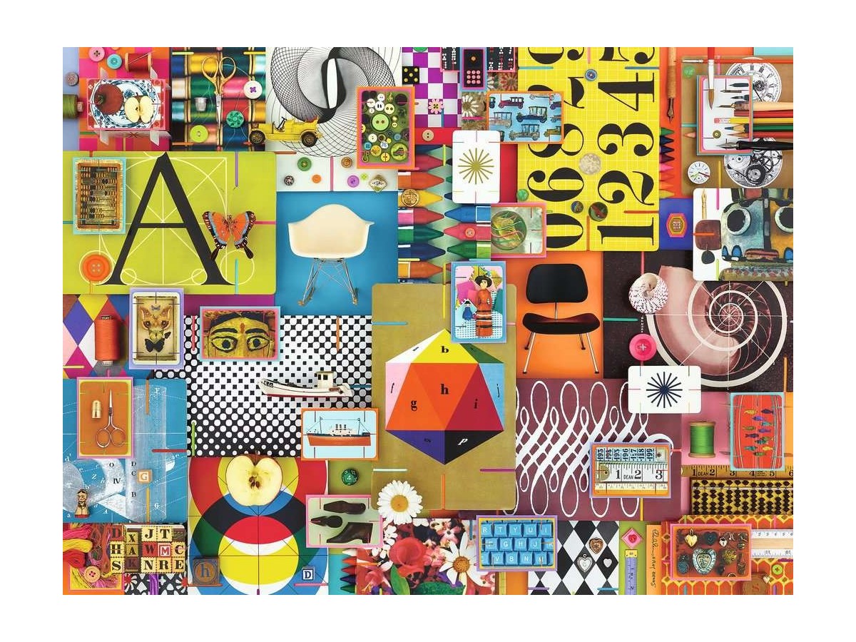 Imaginea acestui puzzle Ravensburger cu 1500 de piese, intitulat Eames House Of Cards, este un colaj vibrant și complex care îmbină diferite obiecte și motive, fiecare segment având propriul stil și paletă de culori. Fiecare secțiune a colajului prezintă diverse articole cum ar fi scaune în stil modern, instrumente muzicale, Număre stilizate, forme geometrice și alte elemente de design. Colajul pare să exploreze relația dintre artă și viața cotidiană, integrând obiecte uzuale într-o compoziție artistică. Compoziția este plină de energie și culoare, fiecare cadru adăugând la narativul vizual eclectic.