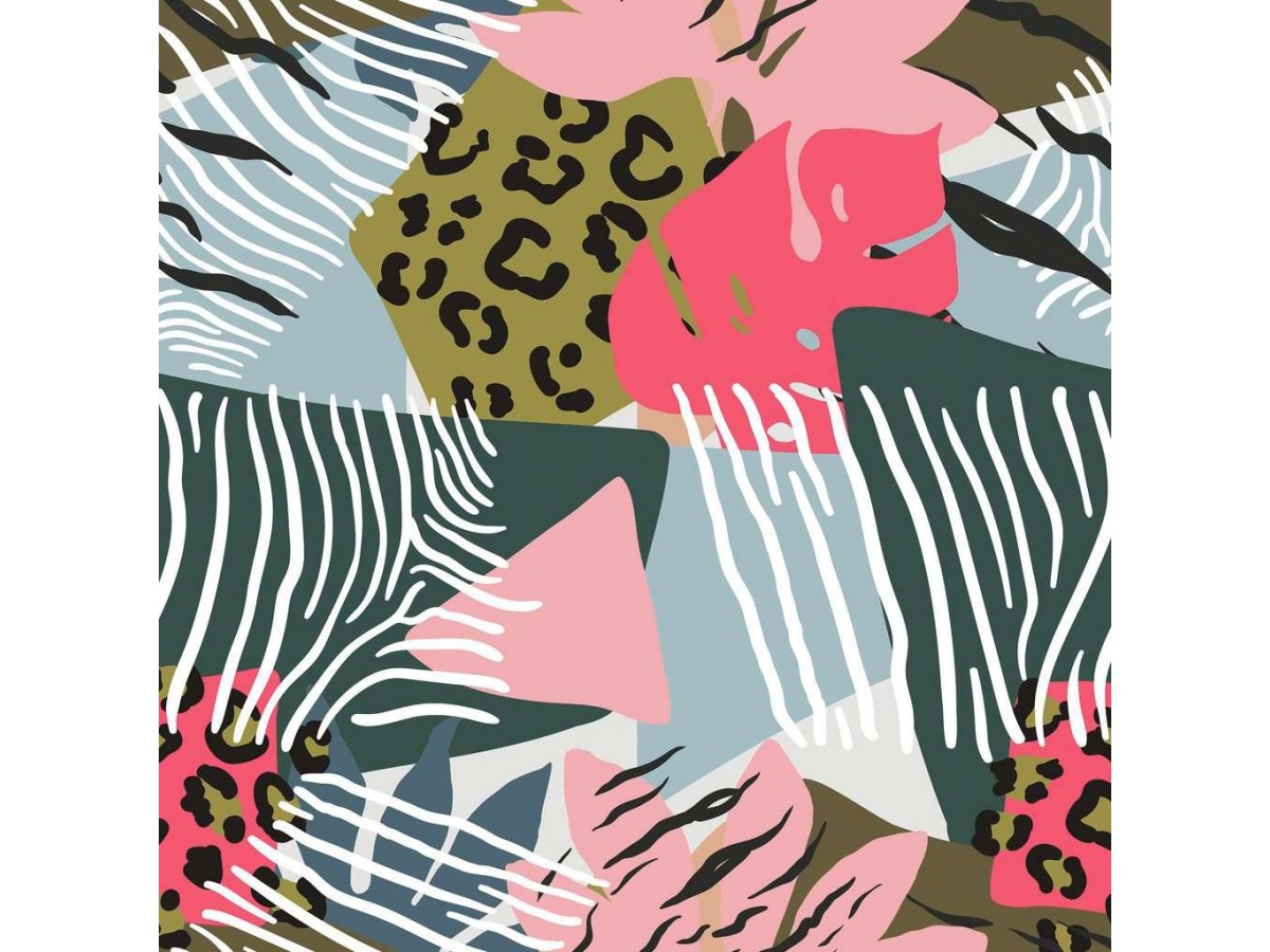 Această ilustrație digitală prezintă un design abstract, compus din multiple forme geometrice și texturi diverse. Culorile predominante sunt tonuri vii de roz, albastru și bej, alternând pe un fundal alb. Printre elementele vizuale distincte se Numără pete ce imită blana animalelor, dungi verticale similare zebrelor și forme care pot aminti de petale de flori sau frunze. Acest amestec de forme și culori creează o compoziție vibrantă, plină de energie și dinamism.