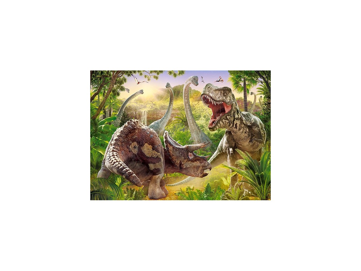 Acest puzzle Castorland cu 180 de piese reprezintă o ilustrație digitală captivantă din lumea preistorică, unde dinozaurii domină peisajul. În centrul atenției, un Tyrannosaurus rex sfâșie aerul cu un urlet puternic, în timp ce se pregătește să se confrunte cu un Triceratops defensiv. În jur, alte specii de dinozauri, precum Brachiosaurus și Pterodactyl, populează jungla luxuriantă, creând o atmosferă fascinantă a unei epoci demult apuse.