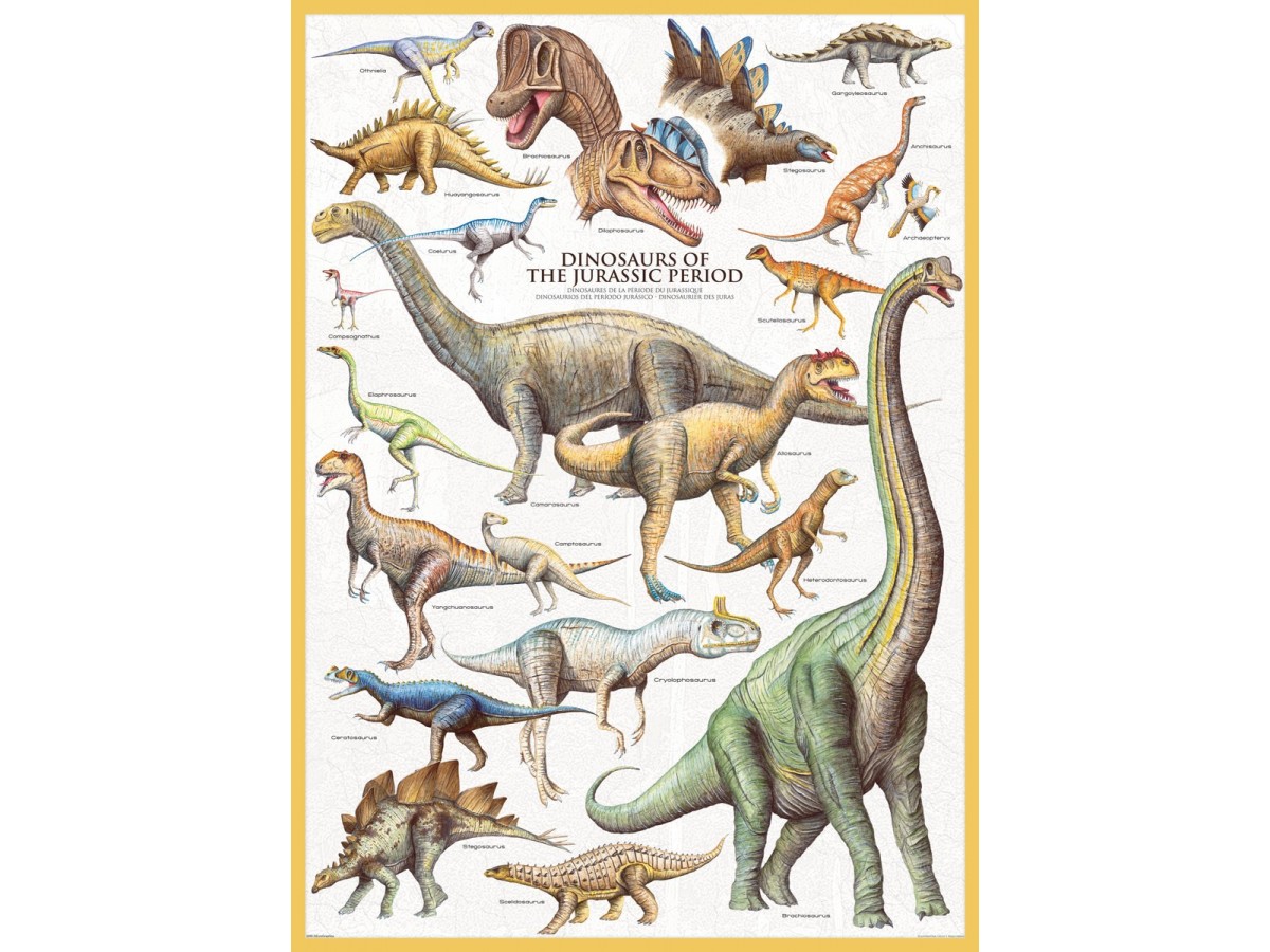 Ilustrația puzzle-ului Eurographics - Dinosaurs of the Jurassic, 1000 piese (6000-0099) surprinde o diversitate fascinantă de dinozauri din perioada Jurasică, fiecare creatură fiind reprezentată în detaliu, cu anatomii bine definite. Pe imagine, putem observa diferite specii precum Brachiosaurus, Stegosaurus și Velociraptor, prezentate în poziții realiste ce reflectă comportamentele naturale ale acestor animale preistorice. Fiecare dinozaur este colorat în nuanțe realiste de verzi, maro și gri, sugerând perfecțiunea camuflajului lor în habitatul natural.
